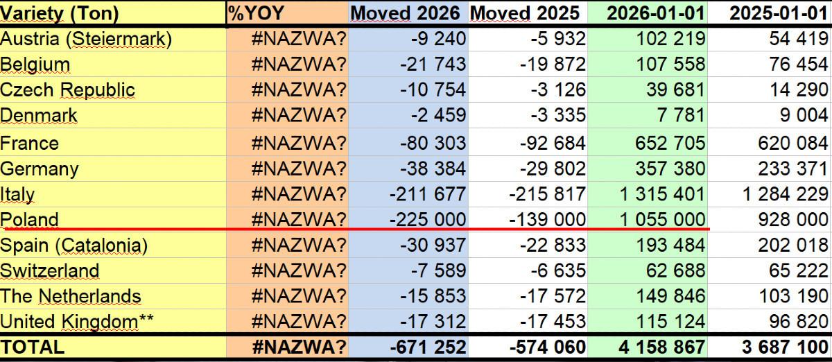 Podobnie jest w Polsce. W naszym przypadku szacunki TRSK mówią o zapasach na poziomie 1,05 mln ton. To dokładnie 127 tys. ton więcej rok do roku – ograniczając się tylko do naszego kraju, różnica nie jest już tak duża jak w przypadku całej Europy. Grudniowa różnica w polskich zapasach rok do roku była większa i wyniosła 138 tys. ton.