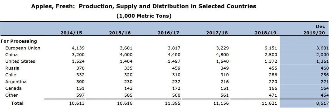 W jednej z tabel wyraźnie widać znacznie mniejsze ilości jabłek przeznaczonych do przetwórstwa, i to w skali światowej. W tym sezonie mamy do czynienia z 27% spadkiem, przy czym mowa o ogromnych ilościach (3 104 000 tony). Największy spadek dotyczy UE. Na przykładzie powyższej tabeli widzimy wyraźnie, że do przetwórstwa tylko w Chinach trafi o pół miliona ton jabłek mniej niż w ubiegłym roku. Poza tym, wolumen owoców przeznaczonych do przetwórstwa, na przestrzeni ostatnich lat także spada. Zatem nie jest prawdą, teza o niebezpiecznej i wzmożonej konkurencyjności chińskiego koncentratu jabłkowego, względem europejskiego, na rynkach światowych. Konkurencja ta, owszem jest widoczna, ale mniejsza niż na przykład w środku obecnej dekady.