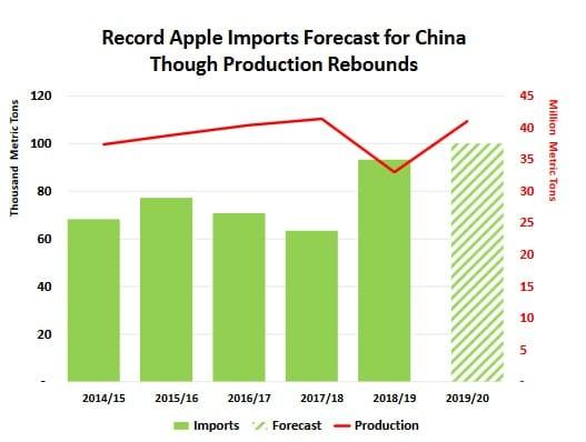 Po ubiegłorocznych przymrozkach, produkcja w Chinach, wzrasta o 8 milionów ton. Z tego powodu, przewiduje się wzrost eksportu do ponad miliona ton. Jednocześnie Chińscy producenci oceniają tegoroczną jakość, jako jedynie, zadowalającą. W związku z tym oczekuje się rekordowego importu jabłek najwyższej jakość na poziomie 100 000 ton.