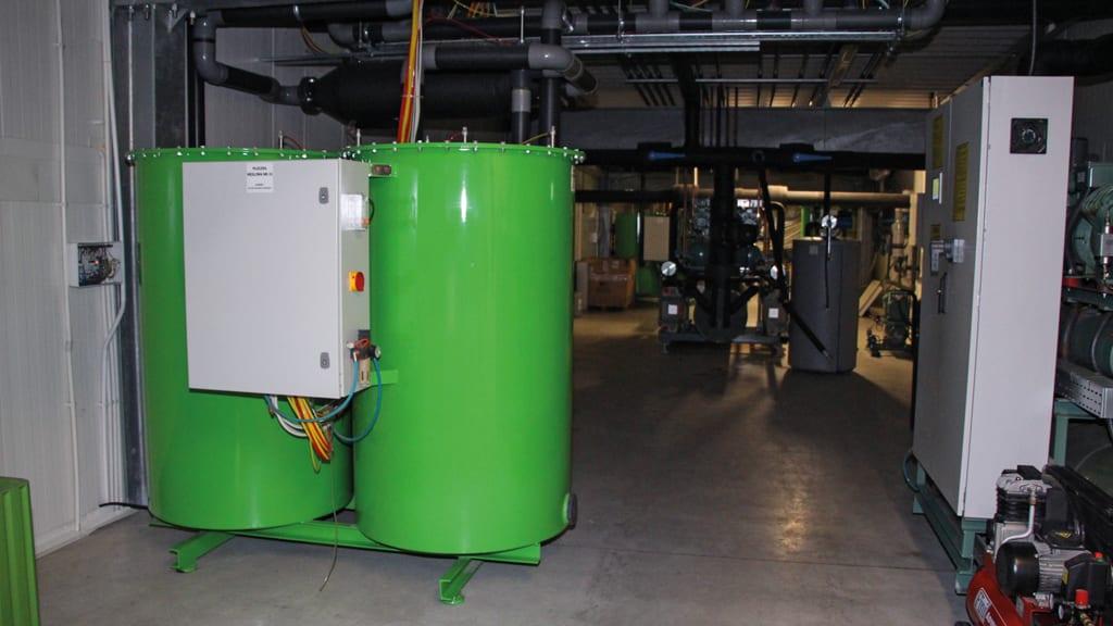 Odszranianie chłodnic realizowane jest przy użyciu ciepłego glikolu gromadzonego w czasie pracy agregatów chłodniczych. Tylko w komorze spedycyjnej (o pojemności 1 tys. t) zamontowano układ freonowy.