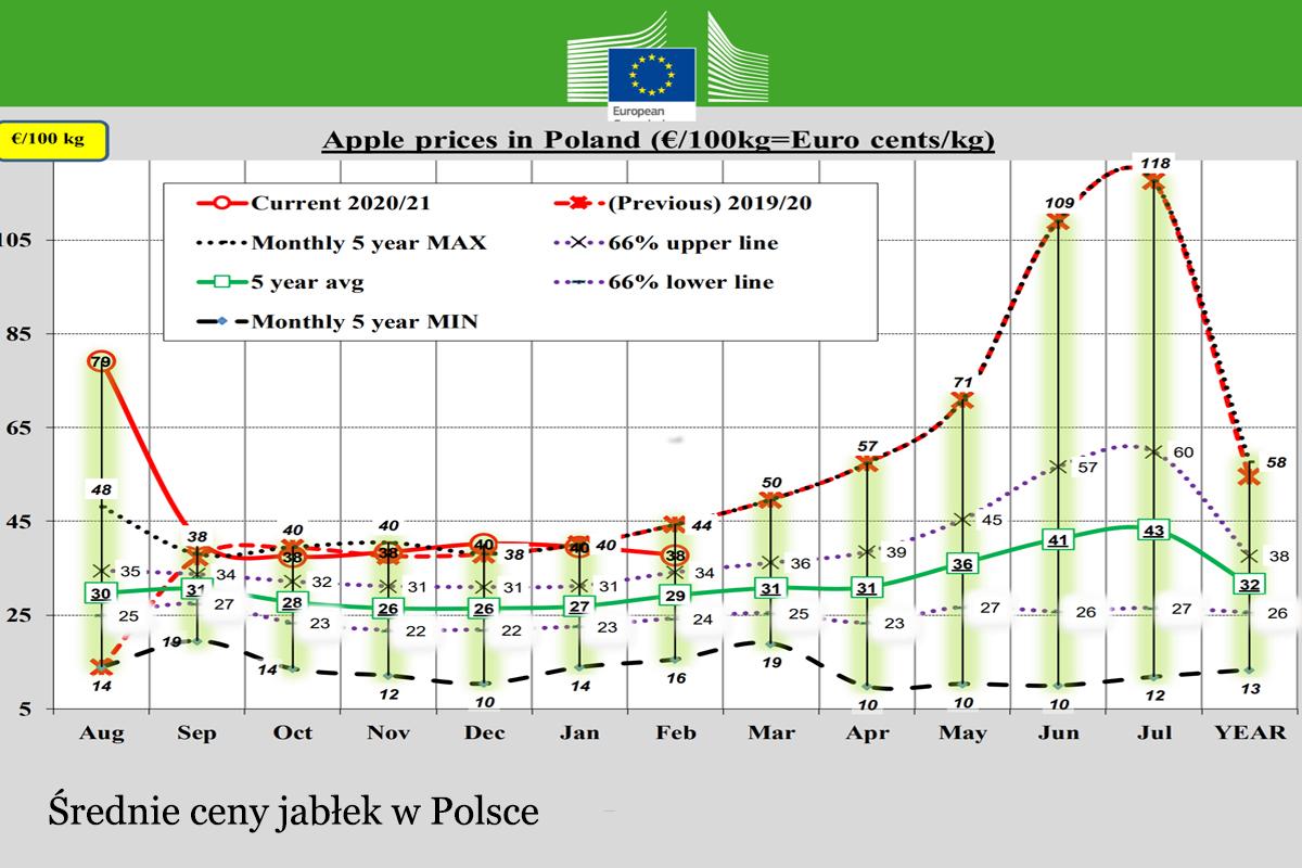 Poniższy wykres przedstawia średnie ceny przesortowanych i zapakowanych jabłek w Polsce. Niestety, przy lutym widzimy spadek z 40 na 38 euro za 100 kilogramów. 38 euro to 172 złote, otrzymujemy zatem średnio 1,72 zł za kilogram jabłek gotowych do sprzedaży i jest to najniższy wynik we Wspólnocie. W ubiegłym roku o tej porze polskie jabłka kosztowały średnio 2,00 zł za kilogram. W połączeniu z widocznymi już niedoborami w wybranych krajach i informacjach, że zbiory były mniejsze od prognozowanych, otrzymujemy zastanawiający obraz polskiego rynku.