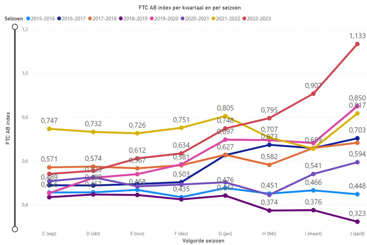 Wykres niżej przedstawia średnie ceny gruszek w Belgii w poszczególnych sezonach. Najwyższa wartość na czerwonej linii prezentuje dane za kwiecień 2023.