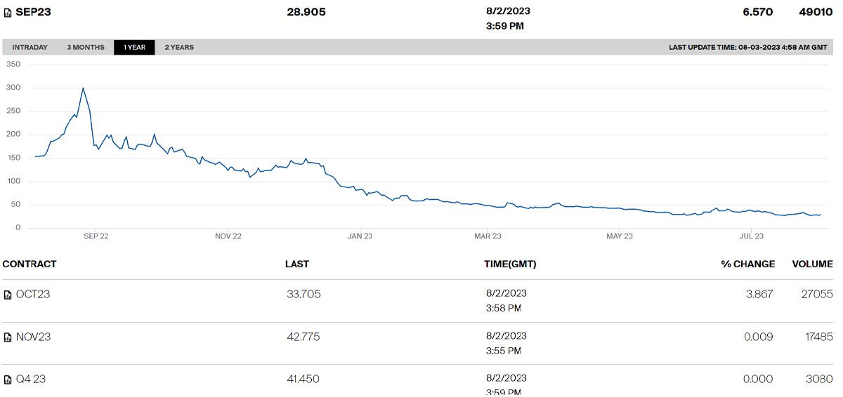Rok temu o tej porze ceny gazu dosłownie szybowały do góry, aby w połowie miesiąca przekroczyć poziom 200 euro (889 zł) za megawatogodzinę. Sierpień był pod tym względem wyjątkowy. Przypomnijmy, że z tego powodu w sierpniu 2022 Grupa Azoty wstrzymała produkcję nawozów. Dopiero od września zaczęły się stopniowe spadki.