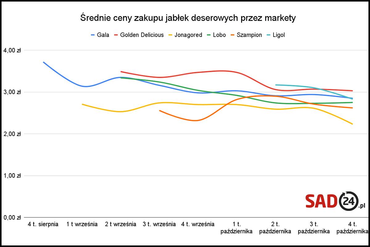 Na przełomie października i listopada markety po raz kolejny nieznacznie obniżyły ceny zakupu jabłek deserowych. Wyjątkiem była odmiana Lobo, która w analizowanym okresie podrożała o symboliczne 3 grosze na kilogramie.
