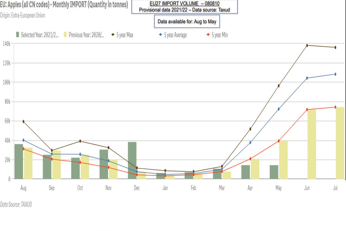 Jak widzimy na wykresie niżej, import w kwietniu był na poziomie około 15 000 ton. Jest to wynik niższy od najniższego wolumenu z pięciu ostatnich lat. Import w maju również będzie niższy niż najniższe wartości z ubiegłych lat. Obecnie do UE importowane są jabłka z południowej półkuli zebrane na początku 2022 roku.