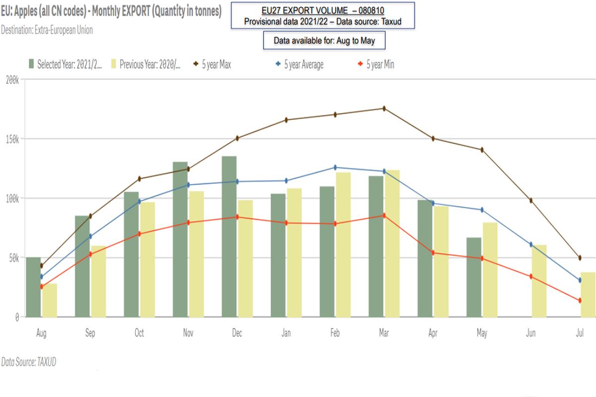 Jeśli chodzi o eksport, to sytuacja nie wygląda źle z punktu widzenia europejskiego sadownictwa. Wykres niżej ukazuje, że eksport do grudnia był na poziomie wyższym od średniej wieloletniej. Natomiast od stycznia do kwietnia Wspólnota eksportowała podobne ilości jabłek, jak w latach ubiegłych. Niestety wyhamowanie eksportu obserwujemy w maju. Jak widać, globalne problemy nie omijają eksporterów z Europy