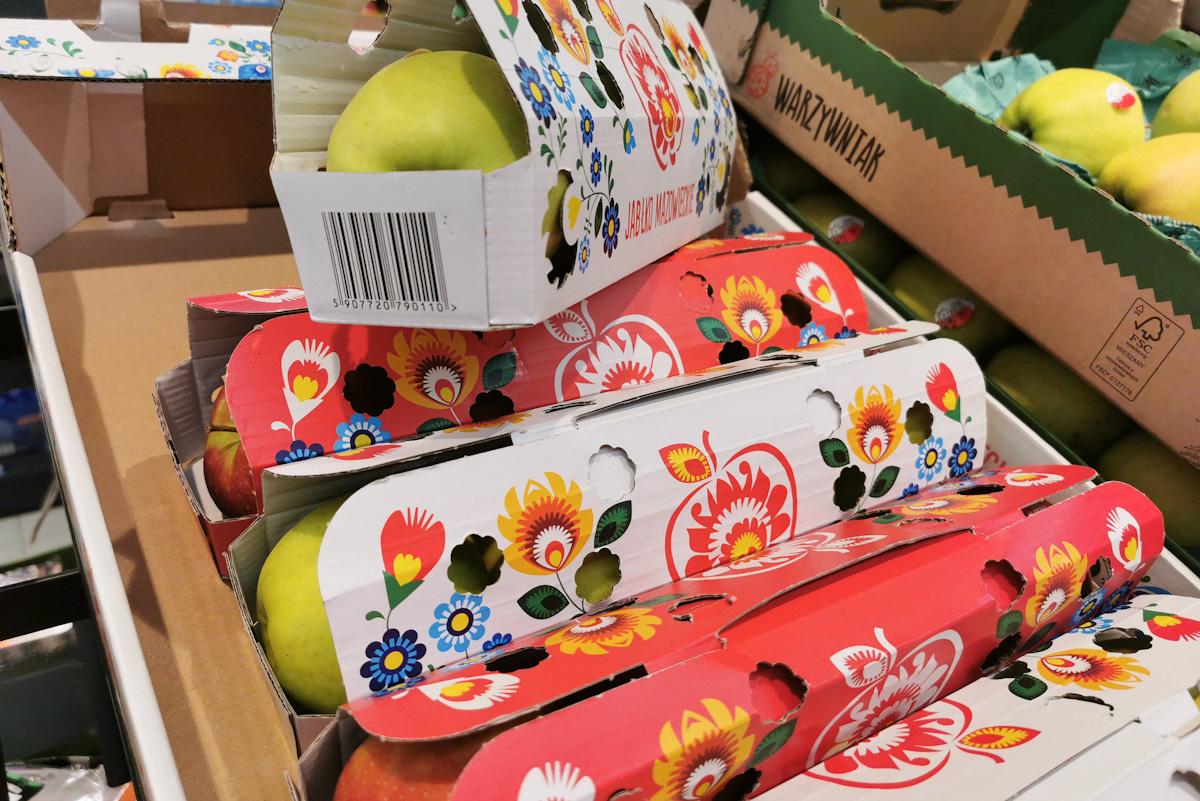 To właśnie kartonowe koszyczki najbardziej przykuły naszą uwagę. Opakowanie wyróżnia się na sklepowej półce. Dla klienta to również większa wygoda przy zakupach. Konsumenci znajdą w opakowaniach po 4 jabłka jakości premium. Całość ozdobiona jest motywem ludowym, co jeszcze bardziej podnosi prezencję w sklepie.