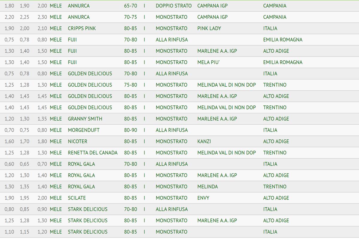 Warto pamiętać, że na dużych rynkach hurtowych we Włoszech sadownicy nie sprzedają bezpośrednio ze swoich aut tak, jak ma to miejsce w Polsce. Handel odbywa się pod dachem za pośrednictwem hurtowni i konsorcjów, których nazwy widzimy w jednej z kolumn. Z lewej strony tabeli przedstawione są ceny.