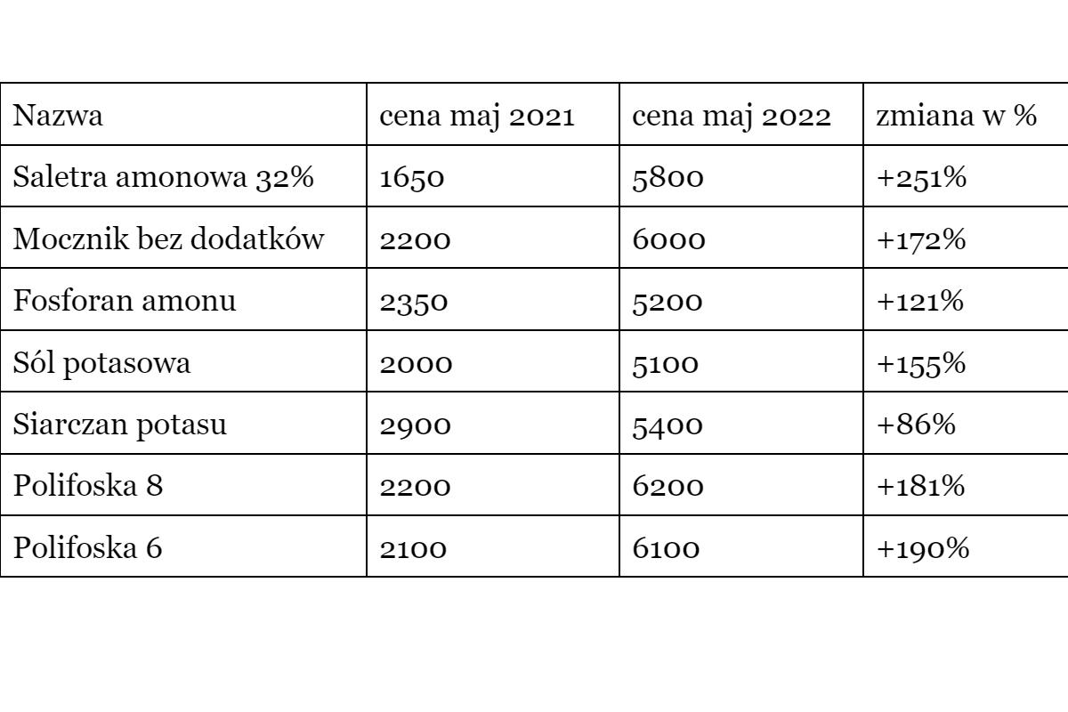 Mazowiecki Ośrodek Doradztwa Rolniczego prowadzi regularne wyliczenia dynamiki cen nawozów w ujęciu rok do roku. Ostatnia publikacja dotyczy stawek za wszystkie rodzaje nawozów z maja 2022 i 2021. W województwie mazowieckim ceny analizowanych nawozów wzrosły średnio o 175% i jest to najwyższy wynik. Najmniej procentowo podrożały nawozy w województwie świętokrzyskim - średnio o 126%.