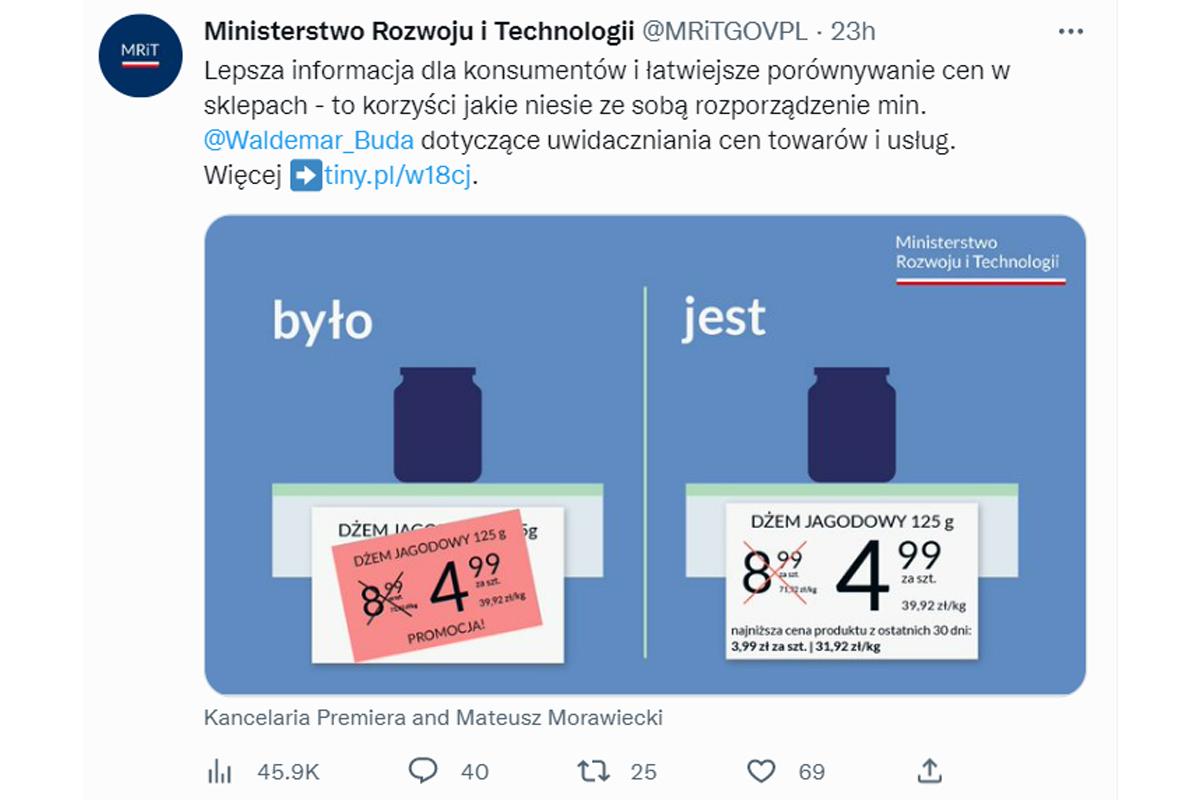 Przepisy rozporządzenia wynikającego z wytycznych Brukseli nakazują między innymi, że cenę, cenę jednostkową lub informację o obniżonej cenie sprzedawca musi uwidocznić na danym towarze, bezpośrednio przy towarze lub w jego bliskości. Miejsce to musi być ogólnodostępne i dobrze widoczne. Wszystko po to, aby konsumenci mogli lepiej porównywać ceny i mieli szerszy dostęp do informacji. Rozporządzenie weszło w życie 1 stycznia 2023 roku. Warto zaznaczyć, że nie jest to inicjatywa resortu, a jedynie wdrożenie w życie unijnej dyrektywy Omnibus.