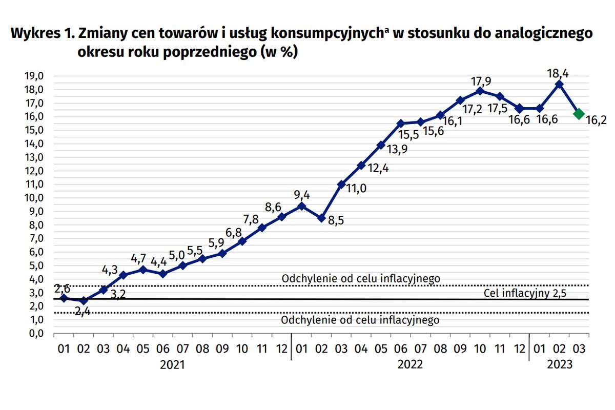 Według szybkiego szacunku Głównego Urzędu Statystycznego, inflacja CPI w marcu nieco spadła. Wyniosła 16,2%. Przed opublikowaniem danych GUS-u, eksperci szacowali, że spadek będzie większy, to znaczy, że marcowy odczyt będzie nieco niższy.