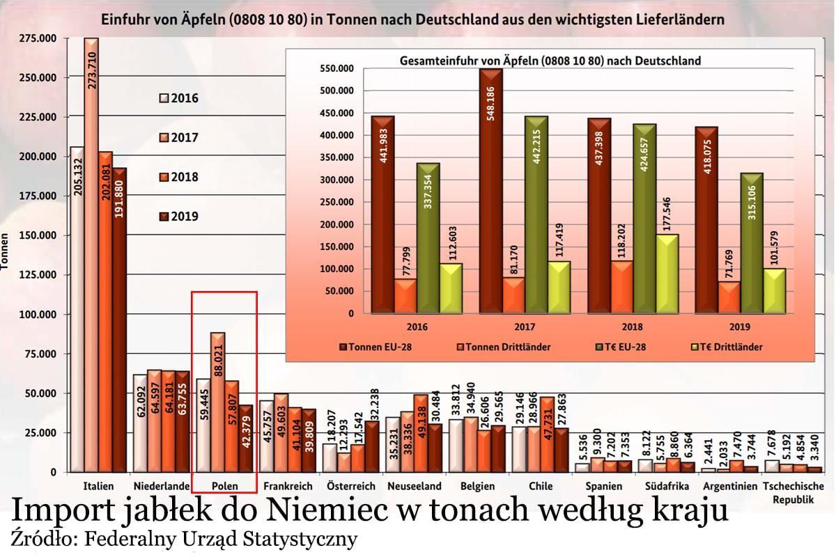 Pomimo sąsiadowania naszych krajów i niskich cen w Polsce, eksport jabłek do Niemiec nadal jest stosunkowo mały i dodatkowo spada na przestrzeni ostatnich lat. Tak wynika z oficjalnych niemieckich danych. Dane te w połączeniu z (chwilowym) brakiem polskich jabłek na niemieckich rynkach hurtowych nie nastrajają optymizmem. Być może jednak są to tylko oficjalne dane.