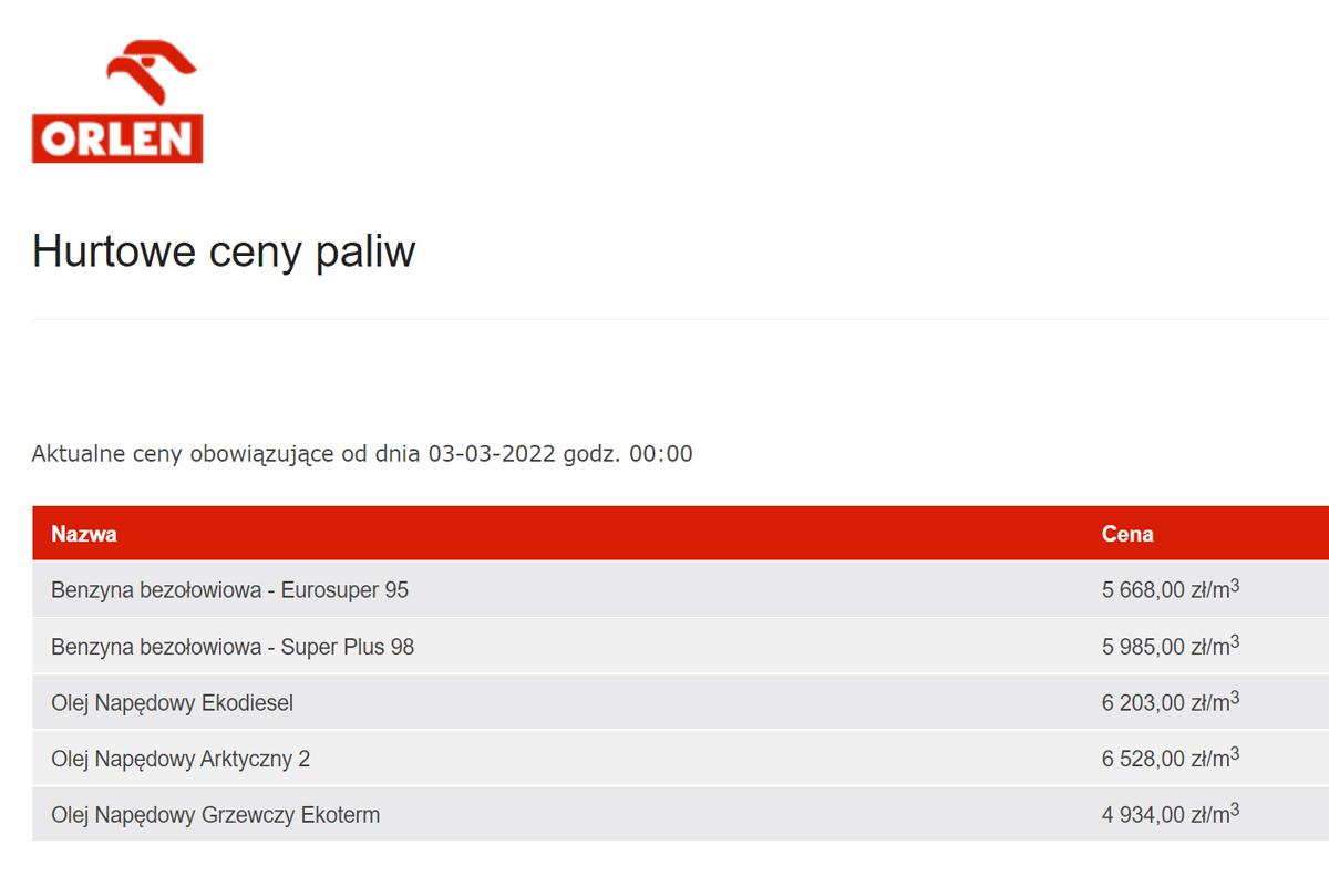 Dziś polskie koncerny po raz kolejny znacząco podniosły ceny paliw w hurcie. W przypadku PKN Orlen cena oleju napędowego w hurcie (netto) wynosi dziś 6,20 złotego za litr. Jest to wzrost aż o 37 groszy na litrze. W ciągu dwóch dni ON podrożał aż o 63 grosze. Nieznacznie niższa cena obowiązuje w grupie LOTOS - 6,16 zł za litr.