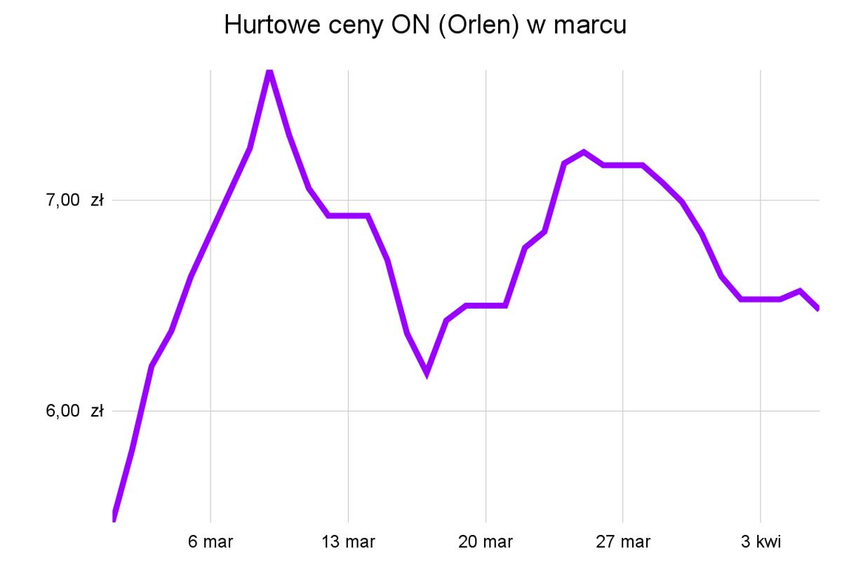 Dziś, czyli 6 kwietnia litr oleju napędowego w hurcie kosztuje (w PKN Orlen) 6,46 zł za litr. To-9 groszowy spadek w stosunku do wczoraj. W grupie LOTOS to samo paliwo kosztuje 2 grosze mniej - 6,44 zł za litr. Niemniej warto spojrzeć na ceny w marcu w nieco szerszej perspektywie.