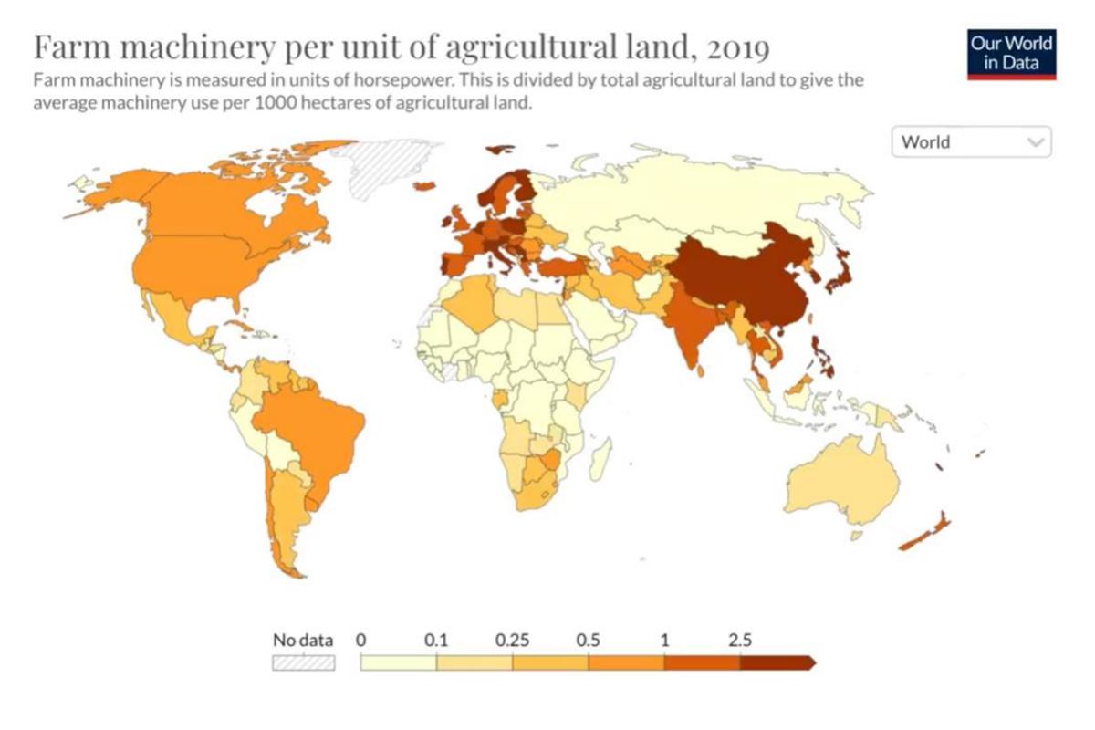 Analiza liczby maszyn w gospodarstwach daje wskazówki na temat rozwoju rolnictwa w danym kraju i możliwości wprowadzania rolnictwa cyfrowego w przyszłości. Poniższa grafika pokazuje liczbę maszyn rolniczych na jednostkę gruntów ornych. Zdaniem naukowca, każdy kraj z kodem koloru powyżej 0,25 ma dobry potencjał na rozwój rolnictwa cyfrowego. Wśród nich znajduje się także Polska. Lepszym wyznacznikiem potencjału rozwoju byłby wskaźnik kwot wydanych na maszyny. Jednak jak wiemy, w rolnictwie technologicznie nie odstajemy od zachodu Europy tak, jak 30 lat temu, co potwierdza nasz potencjał w omawianym kierunku.