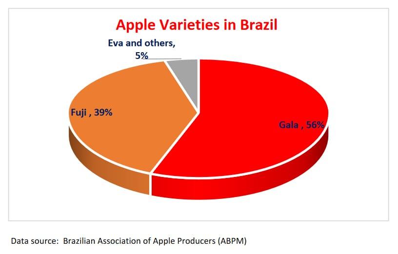 Otóż jak ukazuje Brazylijskie Stowarzyszenie Producentów Jabłek, prym wiodą dwie odmiany. Gala (56%) i Fuji (39%), pozostałe 5% to lokalna odmiana Eva i inne.