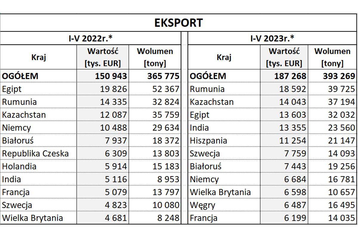 Eksport polskich jabłek w okresie styczeń-maj 2023. Źródło: Biuletyn Ministerstwa Rolnictwa: Rynek owoców i warzyw świeżych - notowania w dniach: 10-19.07.2023 r.