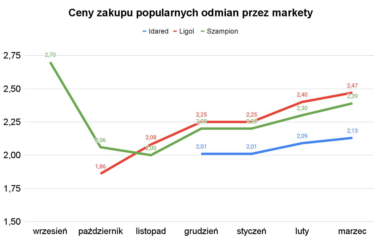 Na poniższym wykresie przedstawione są średnie ceny, jakie dostawcy mogą uzyskać za wybrane odmiany przy sprzedaży do marketów.