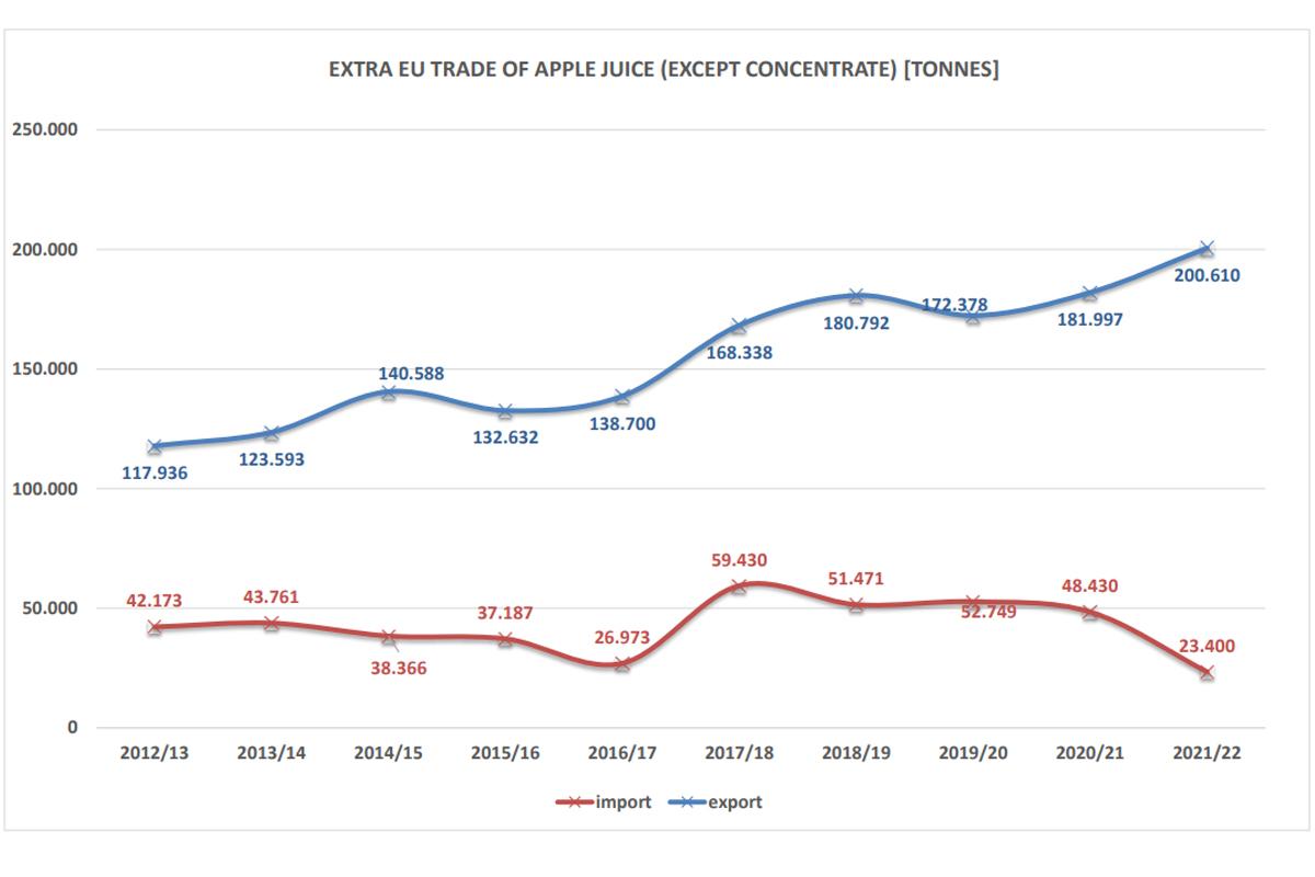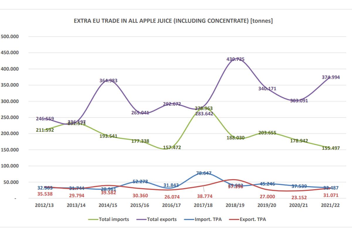 Cała Unia Europejska coraz więcej produkuje, a co za tym idzie coraz więcej eksportuje jabłkowych soków NFC. Dane o handlu międzynarodowym w dużej mierze wynikają z rosnącej produkcji w Polsce.