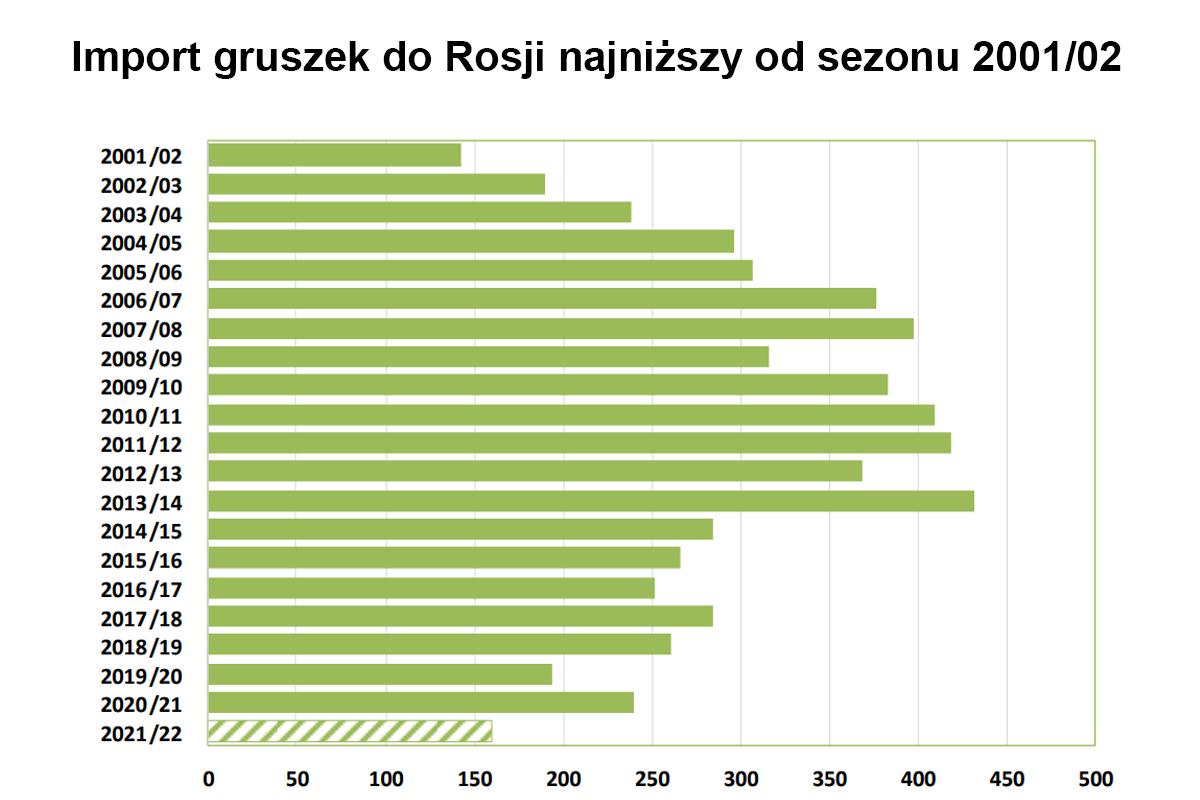 Te same przyczyny sprawiły, że znacząco zmniejszył się także import gruszek. W trwającym sezonie spadnie on o 30% względem ubiegłego roku do poziomu 160 000 ton. Będzie zatem najniższy od niemal 20 lat. W związku z tym Rosja nie jest już największym importerem gruszek na świecie i spada na trzecie miejsce.