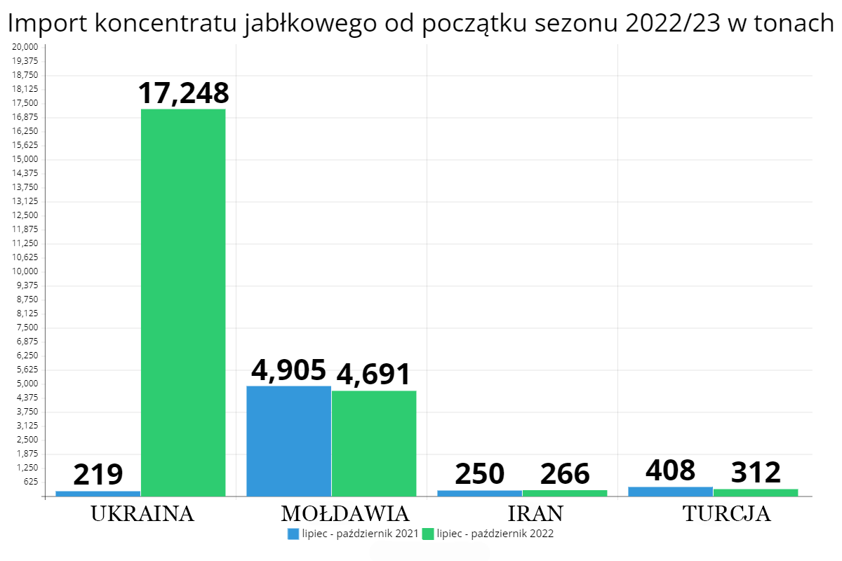 Od początku lipca do końca października tego roku wwieziono do Polski ponad 17 200 ton koncentratu jabłkowego z Ukrainy. W samym październiku było to aż 8014 ton. W analogicznym okresie 2021 roku było to zaledwie 219 ton. Mówimy więc o „astronomicznym” wzroście na poziomie 7700% w skali rocznej! Gdyby tegoroczny import był na porównywalnym poziomie to faktycznie nie miałby on żadnego wpływu na krajowy rynek surowca. Można również powiedzieć, że w takim wypadku zagadnienia w ogóle nie warto byłoby poruszać.