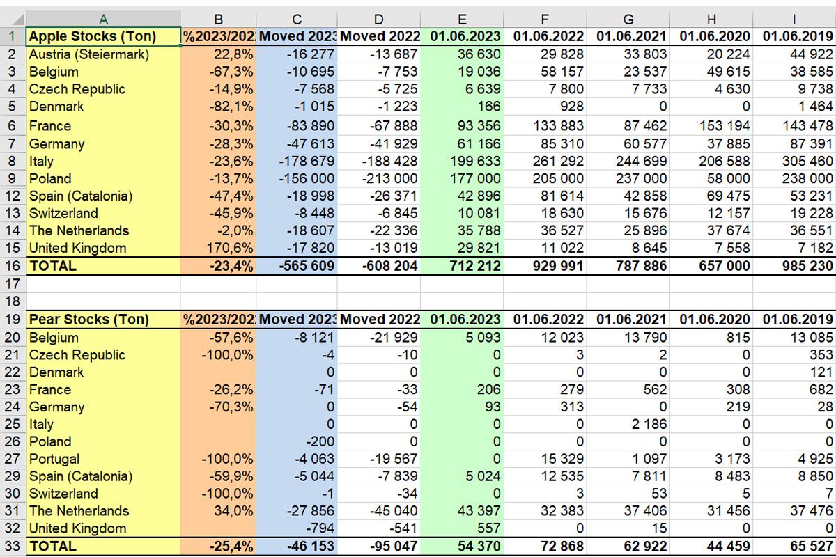 Niemniej w pozostałych europejskich krajach czerwcowe zapasy porównywane do ubiegłorocznych są znacznie niższe niż w Polsce. Na przykład we Francji owoców było o 30% mniej, a Niemczech o 28% mniej. Sumarycznie, w całej Europie jest o 23,4% jabłek mniej. Notujemy spadek z 608 do 565 tysięcy ton jabłek.