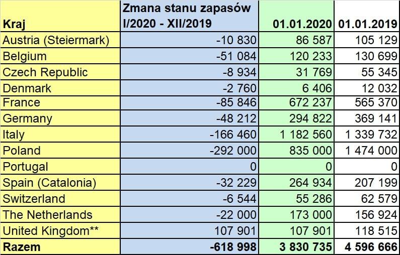 Zapasy jabłek w Polsce i Europie według WAPA - stan na 1.01.2020