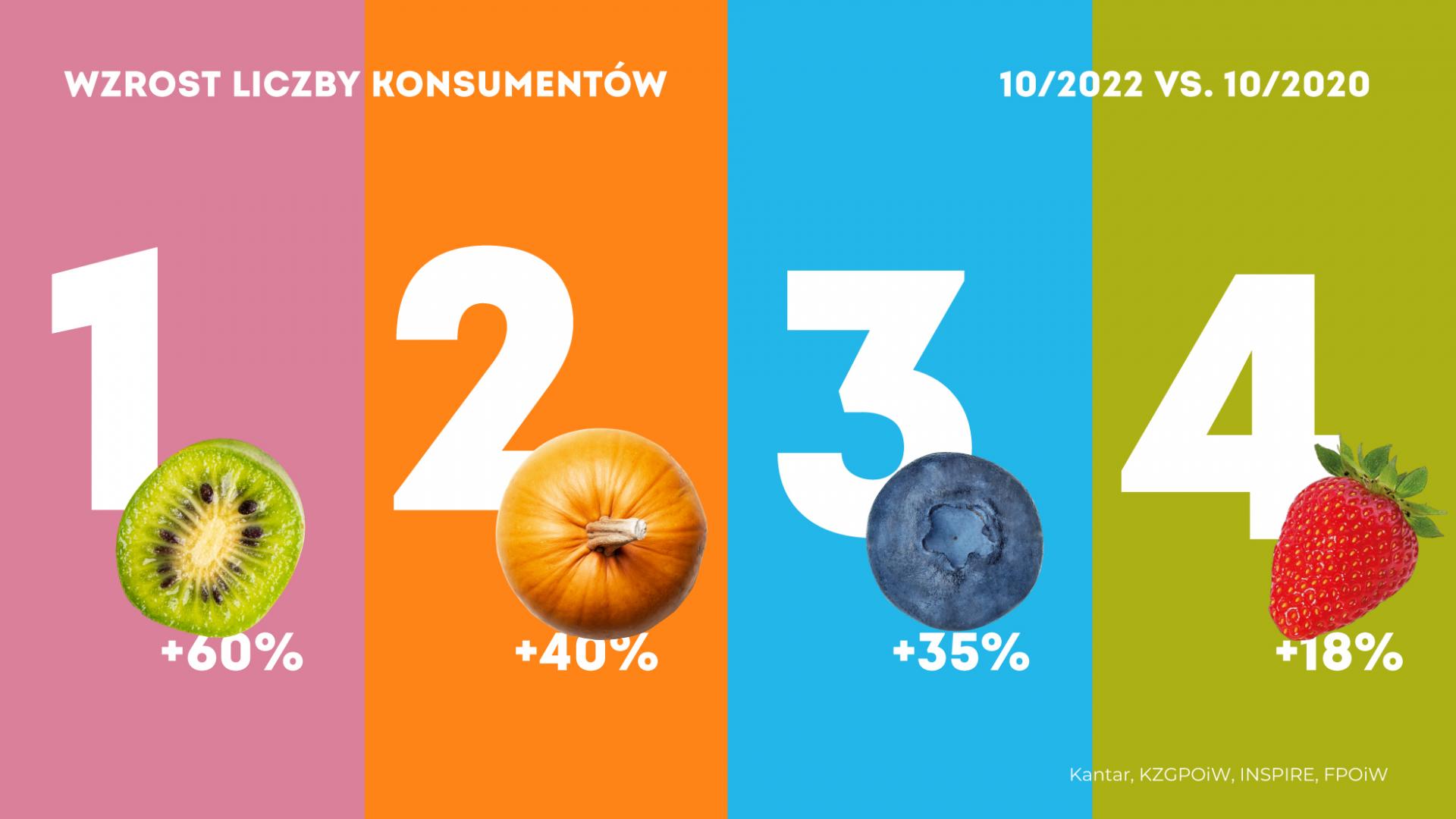 W stosunku do września 2022 roku spożycie jabłek wzrosło o 9%. Na drugim miejscu znalazły się śliwki, spożycie wykazało 63% badanych. 55% Polaków we wrześniu jadło gruszki, a 31% borówki, 30% maliny.