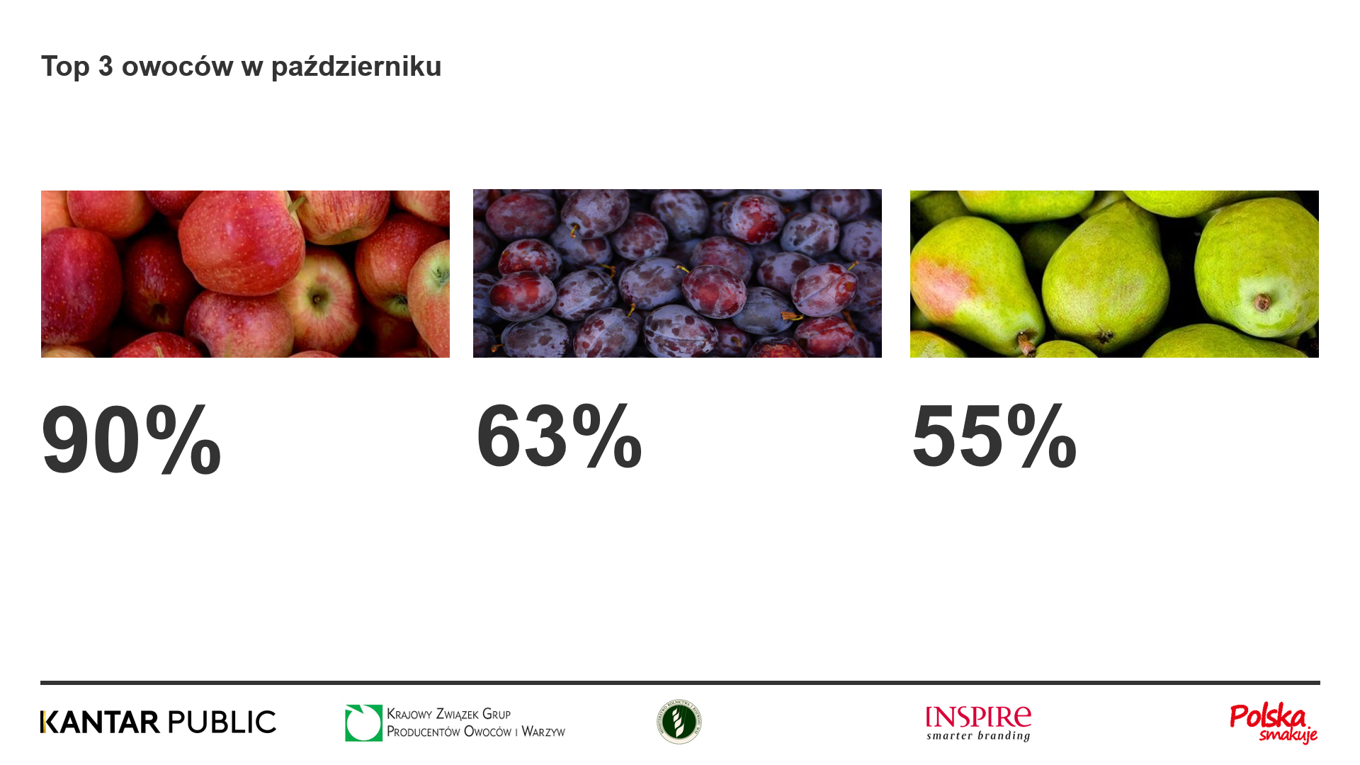 Podobnie jak w latach poprzednich owocem, który cieszył się największą popularnością, były oczywiście jabłka. W tygodniu poprzedzającym badanie jak podaje Kantar, spożywało je dziewięciu na dziesięciu Polaków – 90%.
