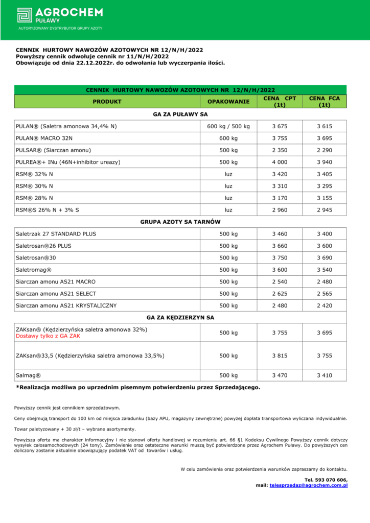 Najnowsze ceny nawozów azotowych Grupy Azoty przedstawiają się następująco: