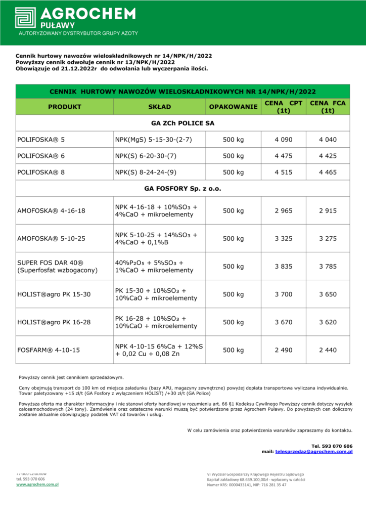 Oto aktualne ceny nawozów wieloskładnikowych w Agrochem Puławy: