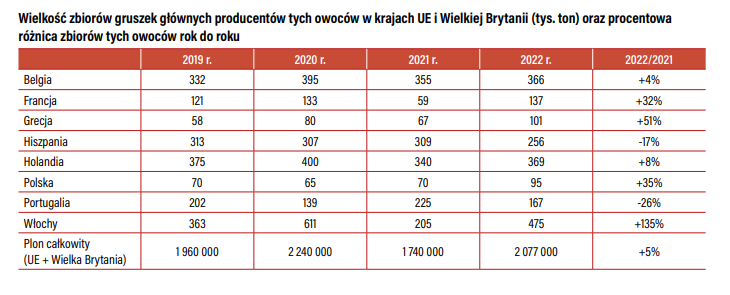 Należy zauważyć, że Belgowie byli w stanie oszacować wzrost produkcji rok do roku o 10 tys. ton (366 tys. ton w roku 2022). Ważnym producentem gruszek jest także Hiszpania (256 tys. ton). Tutaj mamy do czynienia z dość znacznym spadkiem plonowania. Hiszpanie zebrali w 2022 r. o 53 tys. ton mniej gruszek niż w roku 2021 (–17%) i jest to zauważalne, gdyż średnia za lata 2019–2021 wyniosła 309 tys. ton. Do najważniejszej piątki europejskich producentów gruszek należy oczywiście zaliczyć wspomnianych wcześniej Włochów, a także Portugalczyków (z produkcją 167 tys. ton, czyli o 26% w porównaniu do roku 2021).