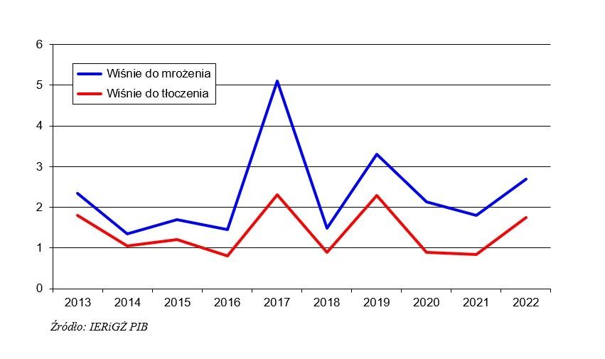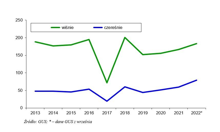 W 2022 r. zbiory wiśni w wyniku korzystnych warunków atmosferycznych przekraczały poziom z roku poprzedniego, a zbiory czereśni były rekordowo wysokie. W wyniku bardzo wysokich zbiorów obniżyły się ceny skupu czereśni. Wzrost zapotrzebowania na zagranicznych rynkach zbytu na mrożonki i soki zagęszczone spowodował natomiast wzrost cen skupu kierowanych do przetwórstwa wiśni. Wzrost cen nie rekompensował jednakże zwiększania kosztów produkcji wiśni. Spadła opłacalność produkcji czereśni. Wobec spodziewanego utrzymania w 2023 r. tendencji wzrostowej kosztów produkcji, poprawa sytuacji dochodowej producentów wiśni, czereśni i innych produktów ogrodniczych wymagałaby istotnego wzrostu cen skupu tych owoców.