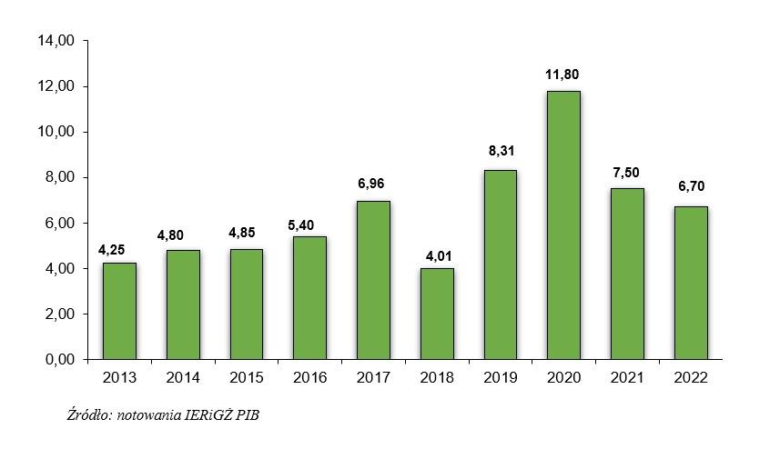 - Przeciętne ceny skupu czereśni w 2022 r. wyniosły 6,7 zł/kg wobec 7,5 zł/kg w roku poprzednim.