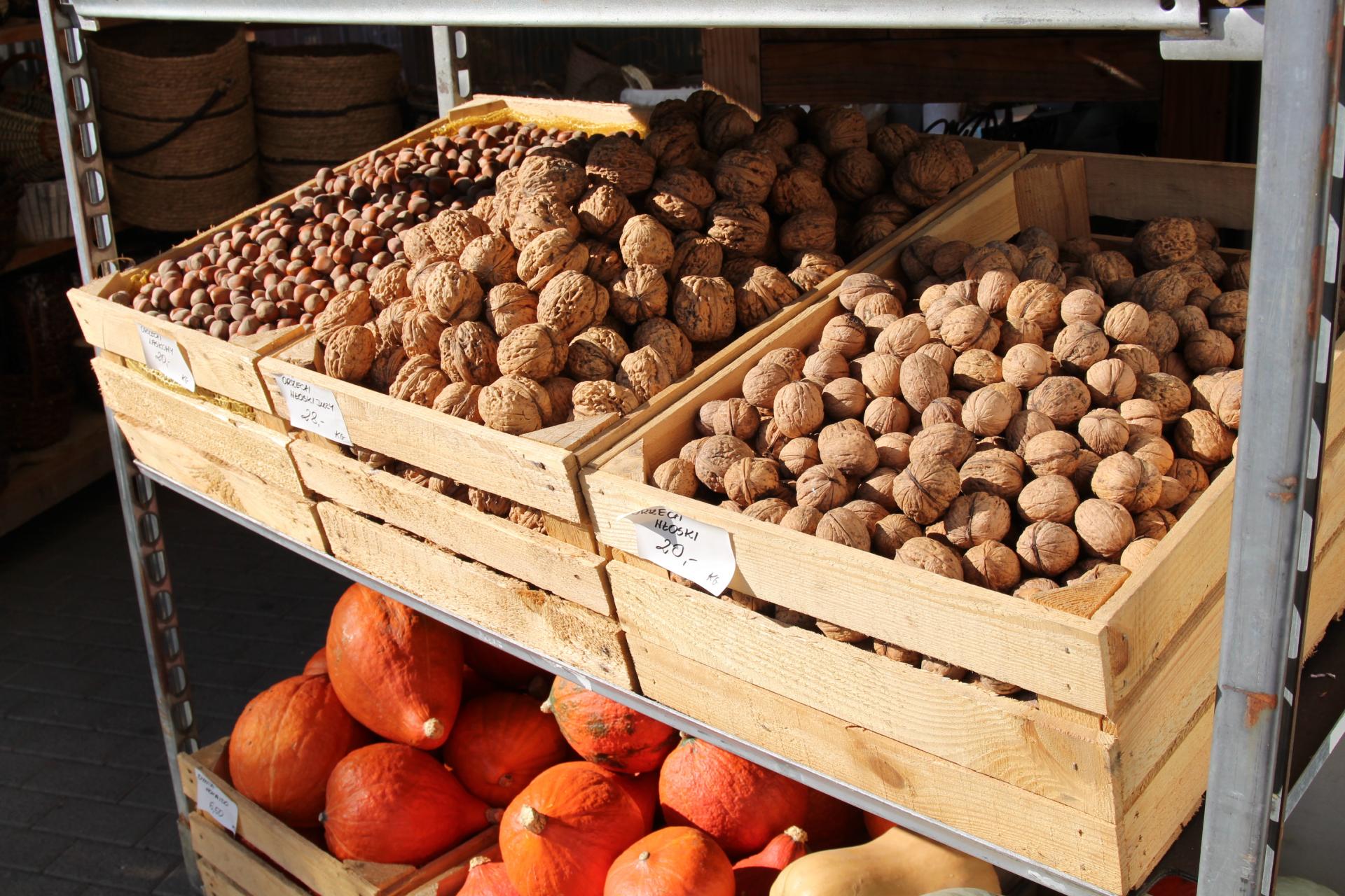 W bezpośredniej sprzedaży znajdują się też owoce orzecha włoskiego – w łupinie i łuskane. Tradycja uprawy tego gatunku sięga w rodzinie Dudek trzy pokolenia wstecz. Zapoczątkował ją dziadek pani Bogumiły, który wyselekcjonował odmianę Leopold. Ma ona charakterystyczne liście o cytrynowo-zielonej barwie, przez niektórych uznawanej za walory ozdobne tej rośliny. Owoce są średnie do małych, bardzo smaczne, a po wysuszeniu nie tracą na objętości. Klienci chętnie je kupują.