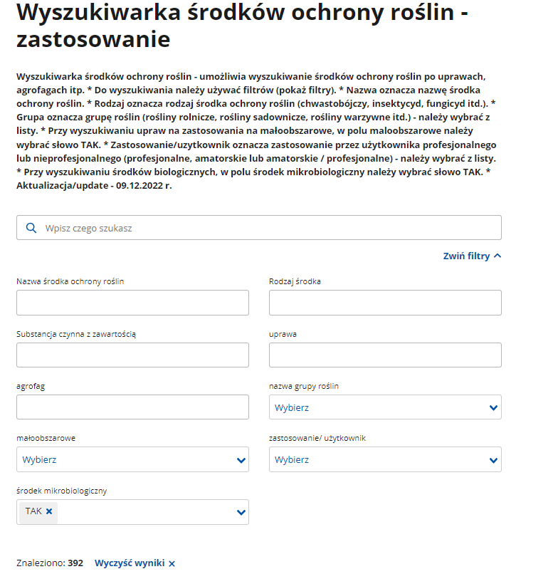 - Pierwszy z nich, wykorzystując wyszukiwarkę środków ochrony roślin. W tym celu w zakładce filtr wybieramy opcję „środek mikrobiologiczny” i wybieramy opcję TAK i spośród aktualnie dostępnych 392 preparatów wybieramy te, które nas interesują. https://www.gov.pl/web/rolnictwo/wyszukiwarka-srodkow-ochrony-roslin---zastosowanie.