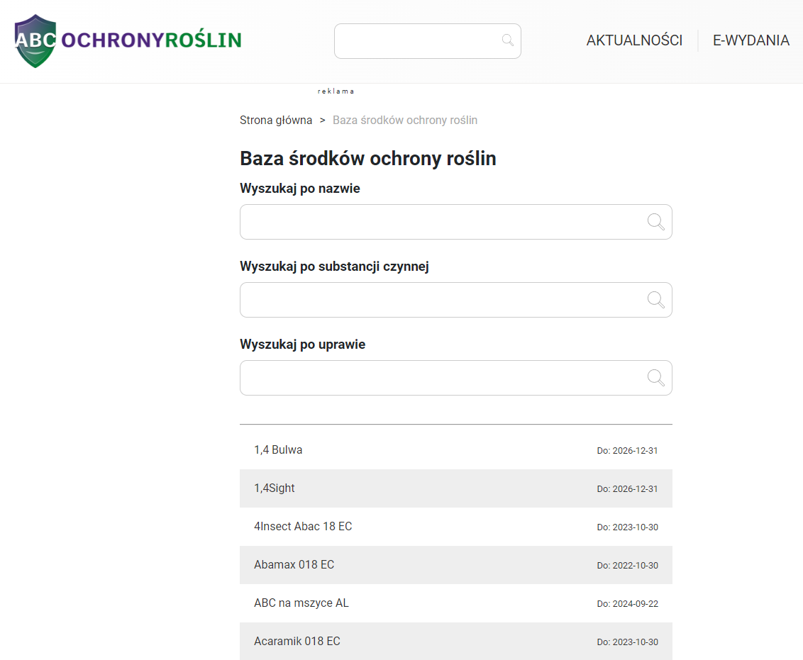 Można również skorzystać z naszej wyszukiwarki środków ochrony roślin, która zawiera wszystkie dostępne aktualnie preparaty na rynku. Aktualizowana jest co miesiąc i dostępna pod tym linkiem: http://abcochronyroslin.pl/bazy/baza-srodkow-ochrony-roslin