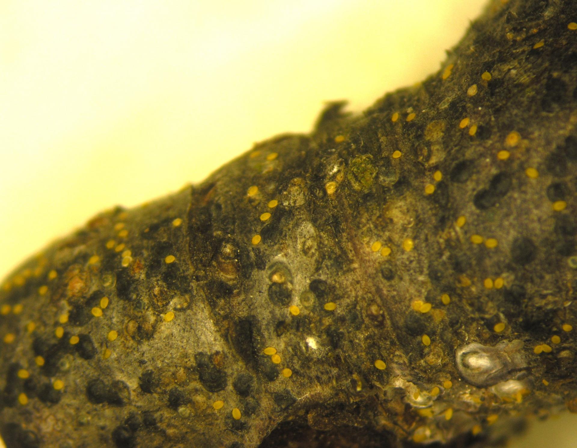 W sadzie szkodnik często zostaje wykryty dopiero w momencie, kiedy tarczki z charakterystycznym karminowym halo wokół nich znajdowane są na blaszkach liściowych i zawiązkach owoców. Jednak pojawiające się podczas żerowania szkodnika przebarwienia mogą być błędnie identyfikowane jako objawy np. zastosowania nawozów czy środków ochrony roślin w niewłaściwych warunkach pogodowych.