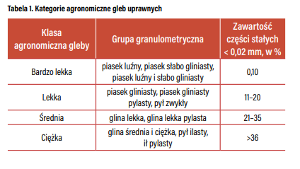 Odczyn gleby to jej właściwość wyrażona przez stosunek stężenia jonów wodorowych H+ w roztworze glebowym. Od tego stosunku zależy, czy gleba ma odczyn kwaśny, czy zasadowy, co decyduje o jej innych właściwościach. W celu ułatwienia obliczeń duński chemik Soren Sorensen w 1909 r. wprowadził do powszechnego użytkowania skalę pH. Definiuje on, iż pH to ujemny logarytm (pH = –log H+) ze stężenia jonów wodorowych, mieszczący się w zakresie od 0 do 14, gdzie pH=7 to odczyn obojętny, pH >7 to odczyn alkaliczny, a pH<7 to odczyn kwaśny. Zazwyczaj odczyn gleb uprawnych waha się w granicach od pH 4 do 8,5. Odczyn gleby ma ogromny wpływ na jej właściwości, kondycję i parametry. Z kolei o samym odczynie gleby decyduje bufor glebowy, który zależy od klasy agronomicznej gleby i zawartości próchnicy. Aby zwiększyć pH o jedną jednostkę na glebach cięższych, o wyższej zawartości próchnicy, należy wprowadzić większą ilość jonów wodorotlenowych – czyli w praktyce ilość tlenku wapnia (CaO) wyższą niż na glebę lżejszą, o niższej zawartości próchnicy. Dlatego aby móc prawidłowo podejść do dalszych zagadnień związanych z regulowaniem odczynu i dostarczaniem Ca2+ do kompleksu sorpcyjnego, w pierwszej kolejności należy ocenić właśnie klasę agronomiczną gleby. Kategoria agronomiczna gleby to cecha jakościowa wyznaczona na podstawie grupy granulometrycznej lub udziału cząstek o średnicy <0,02 mm (tabela 1).
