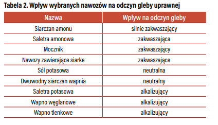 Rolnik, aby osiągnąć przyzwoity plon, dostarcza do gleby różne nawozy. Dlatego bardzo ważna jest znajomość podstawowych właściwości aktualnie stosowanego nawozu oraz jego wpływu na odczyn gleby – czy wybrany produkt będzie glebę zakwaszał, będzie miał na nią wpływ neutralny czy alkalizujący (tabela 2).