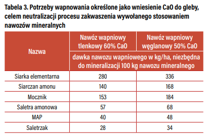 Do wzrostu zakwaszenia gleb przyczynia się również siarka. Jest ona dostarczana m.in. wraz z nawozami, szczególnie siarczanem potasu czy siarczanem magnezu – powszechnie stasowanymi na plantacjach roślin jagodowych zamiast form chlorkowych (chlorku potasu lub rzadziej chlorku magnezu). A więc wapnowanie to zabieg niezbędny do równoważenia skutków zakwaszenia wywołanego przez stosowanie nawozów mineralnych (tabela 3).