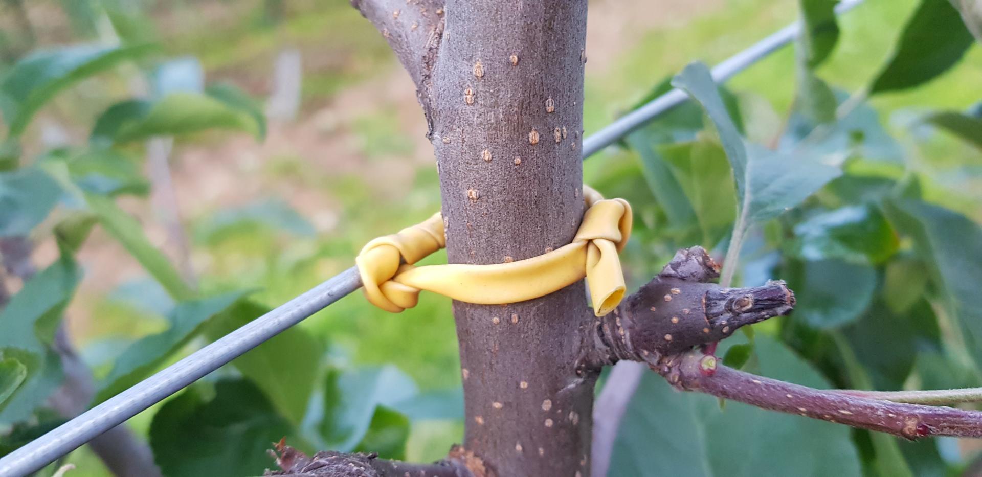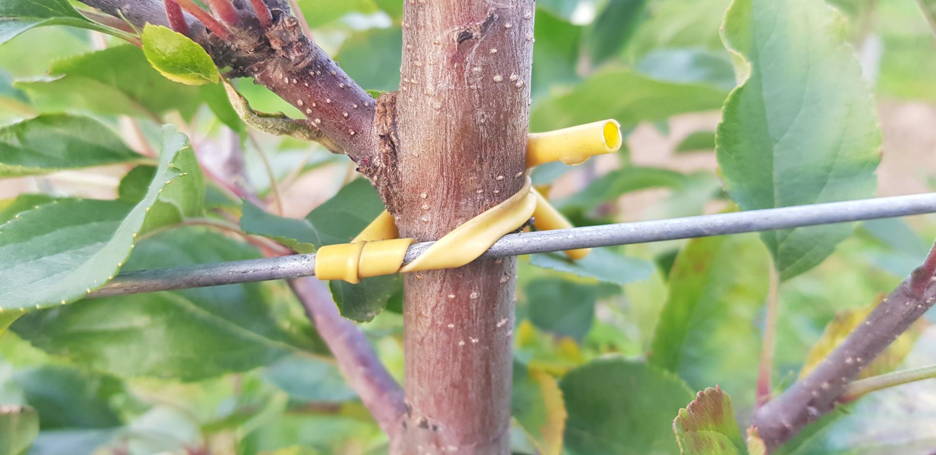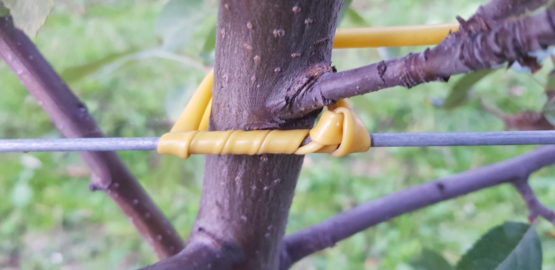Diabeł tkwi w szczegółach: ważne jest, jakiego używamy wiązadła. W handlu dostępne są różnego typu wężyki do wiązania drzewek. Ich cena jest bardzo różna, ale jakość – również. O ile jakość wężyków miała mniejsze znaczenie w przypadku wiązania do tyczek, o tyle wiążąc drzewka bezpośrednio do drutów powinniśmy korzystać z wężyków miękkich, elastycznych (rozciągliwych), odpornych na promieniowanie słoneczne i trwałych (przynajmniej 10 lat). Wężyki tego typu nazywane są przez niektórych "tyrolskimi". Takie wężyki powinny wytrzymać cały okres trwania sadu, rozciągając się w miarę grubienia drzewek. Zwracam uwagę, że elastyczne wężyki są droższe, ale też ze względu na ich rozciągliwość – bardziej wydajne.