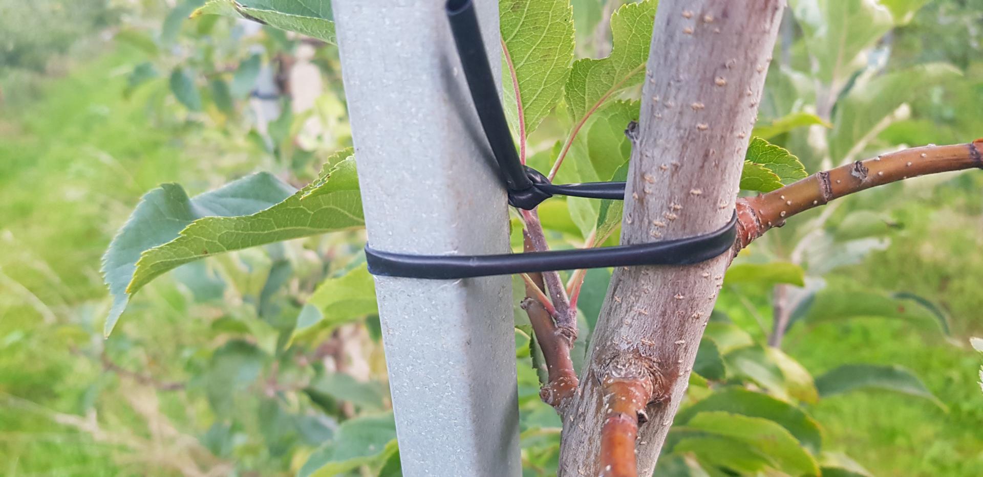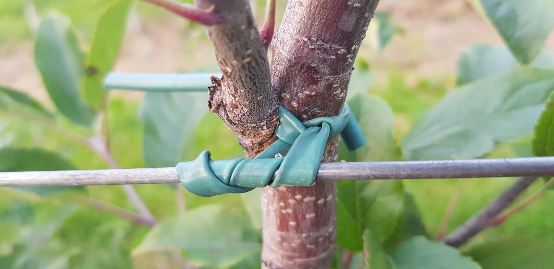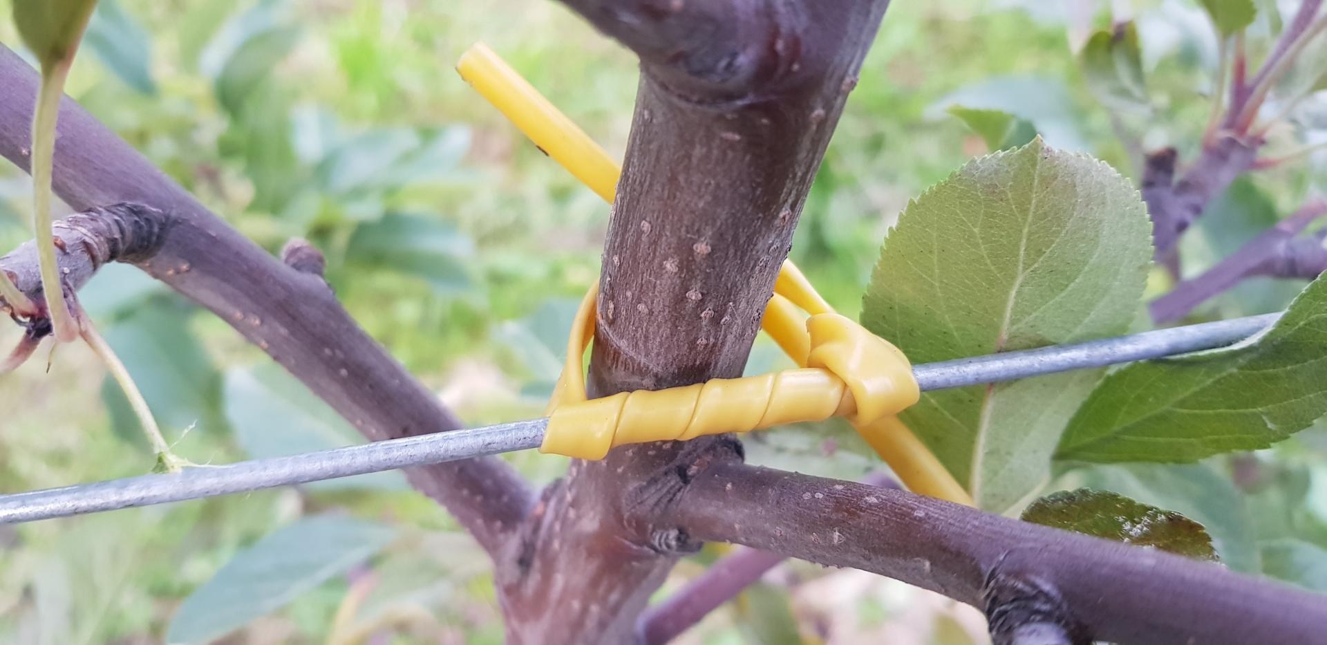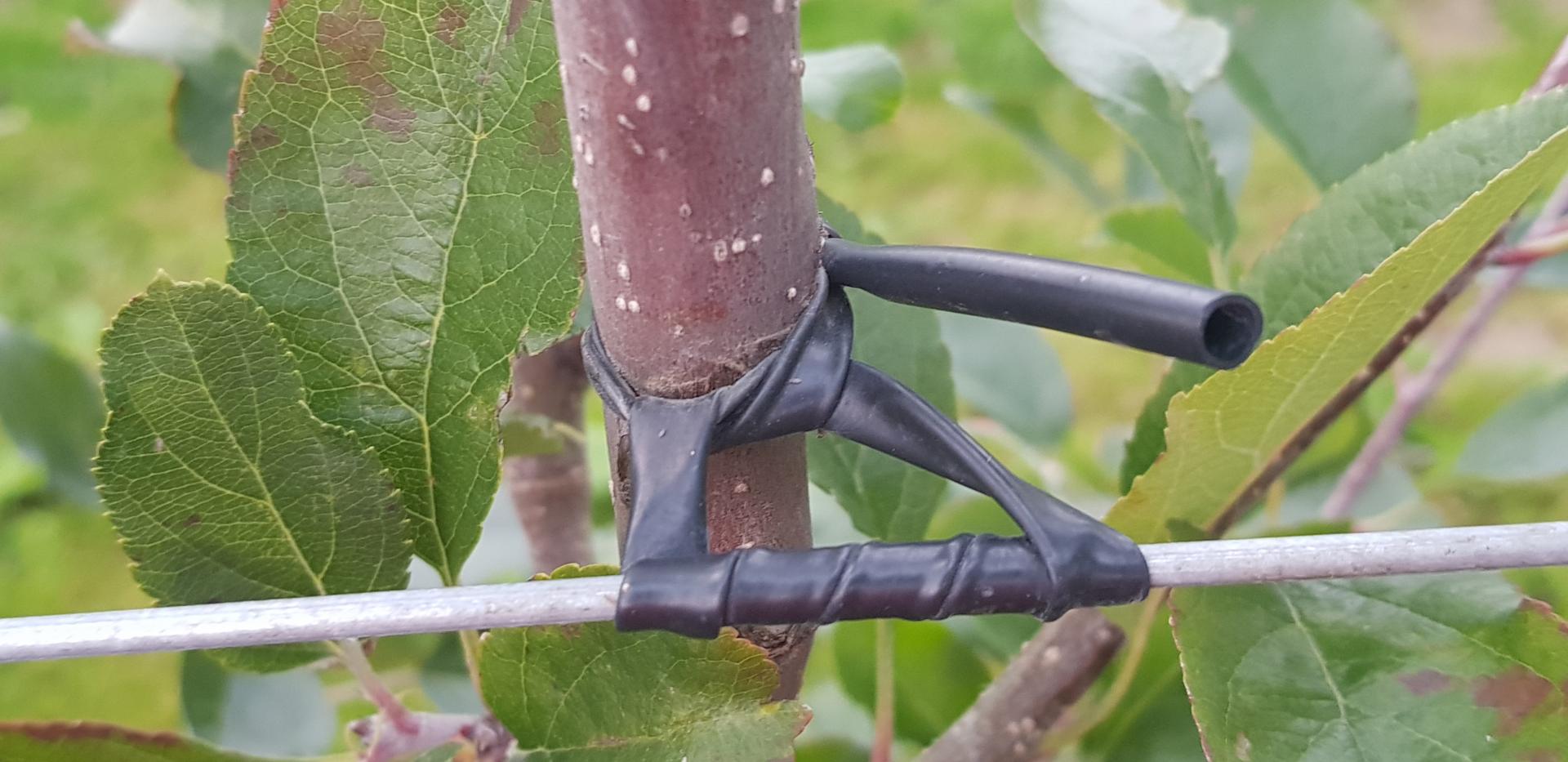 Diabeł tkwi w szczegółach: ważne jest, jakiego używamy wiązadła. W handlu dostępne są różnego typu wężyki do wiązania drzewek. Ich cena jest bardzo różna, ale jakość – również. O ile jakość wężyków miała mniejsze znaczenie w przypadku wiązania do tyczek, o tyle wiążąc drzewka bezpośrednio do drutów powinniśmy korzystać z wężyków miękkich, elastycznych (rozciągliwych), odpornych na promieniowanie słoneczne i trwałych (przynajmniej 10 lat). Wężyki tego typu nazywane są przez niektórych "tyrolskimi". Takie wężyki powinny wytrzymać cały okres trwania sadu, rozciągając się w miarę grubienia drzewek. Zwracam uwagę, że elastyczne wężyki są droższe, ale też ze względu na ich rozciągliwość – bardziej wydajne.