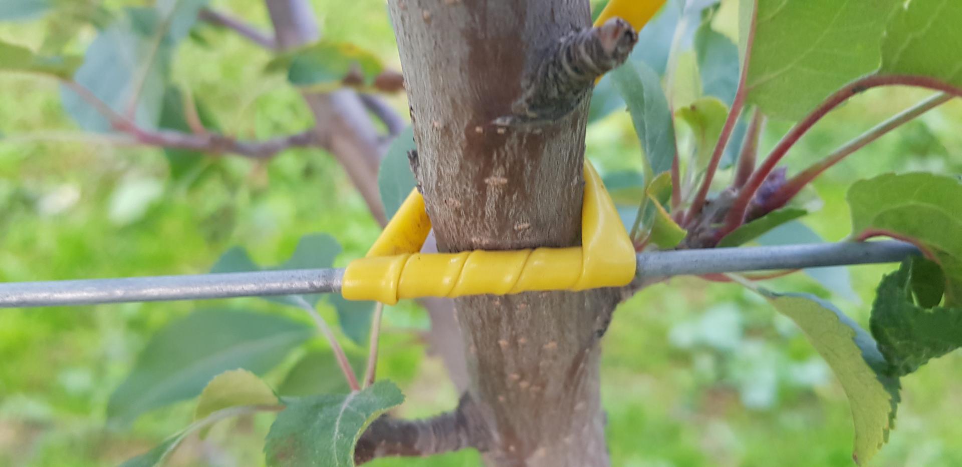 - Drzewka należy mocować do drutów tak, aby ich pozycja była stabilna – nie można pozostawiać nadmiernego luzu, aby nie były kołysane przez wiatr, bo najczęściej właśnie wtedy powstają otarcia. A więc wiązanie luźne "na około" lub "w luźną ósemkę" będzie szkodliwe. To stare metody – zupełnie nie sprawdzające się w tej technologii.