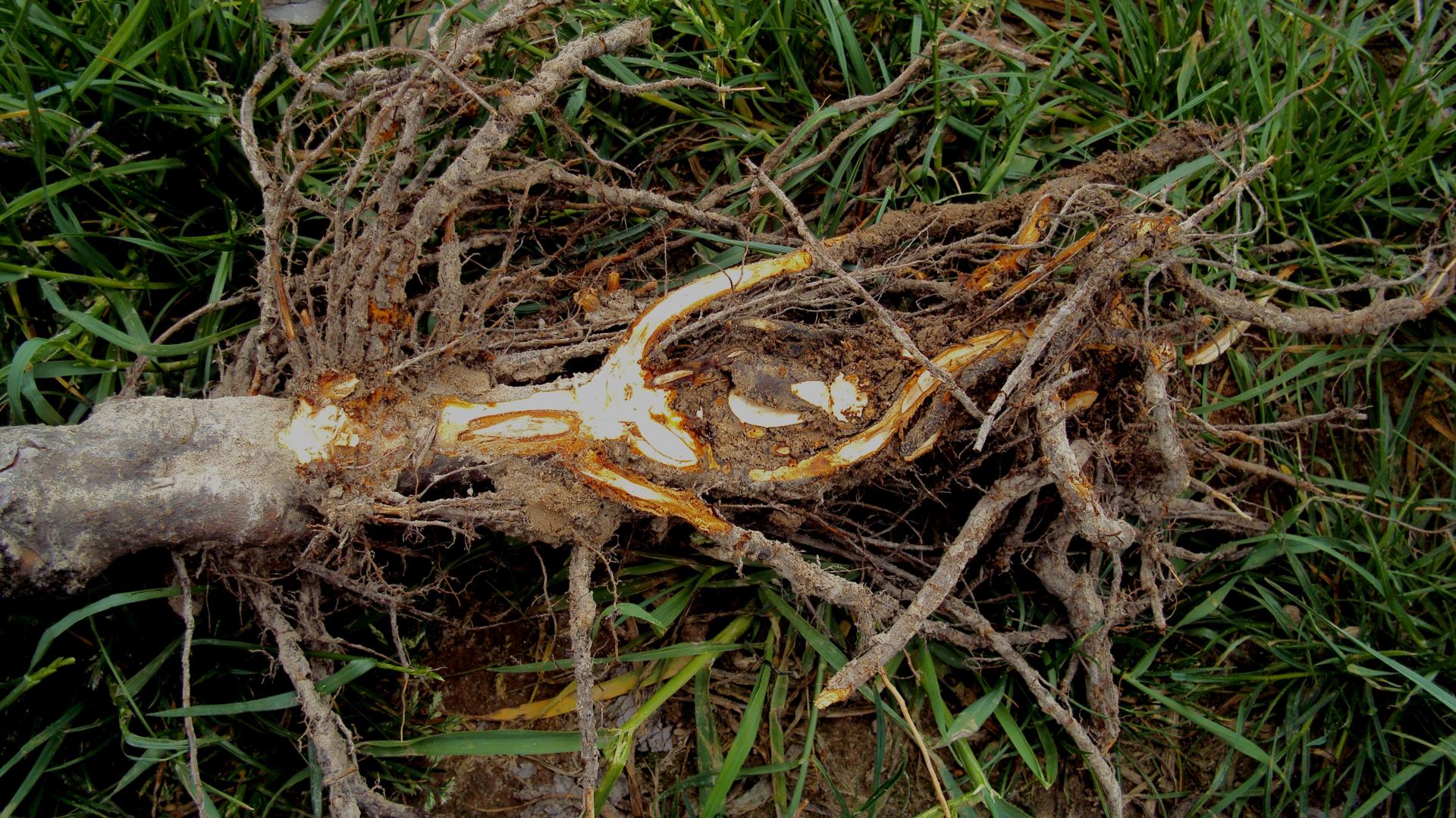 Ma to miejsce przede wszystkim w tych nasadzeniach, gdzie jest większa presja larw w glebie i przeważają te dwu- i trzyletnie (bo są najbardziej żarłoczne). Taka reakcja roślin wynika z faktu, że szkodnik ogryza korę z szyjki korzeniowej i grubszych korzeni lub odcina je, a te drobne korzenie zjada (w konsekwencji łatwo jest wyjąć młode rośliny z gleby).