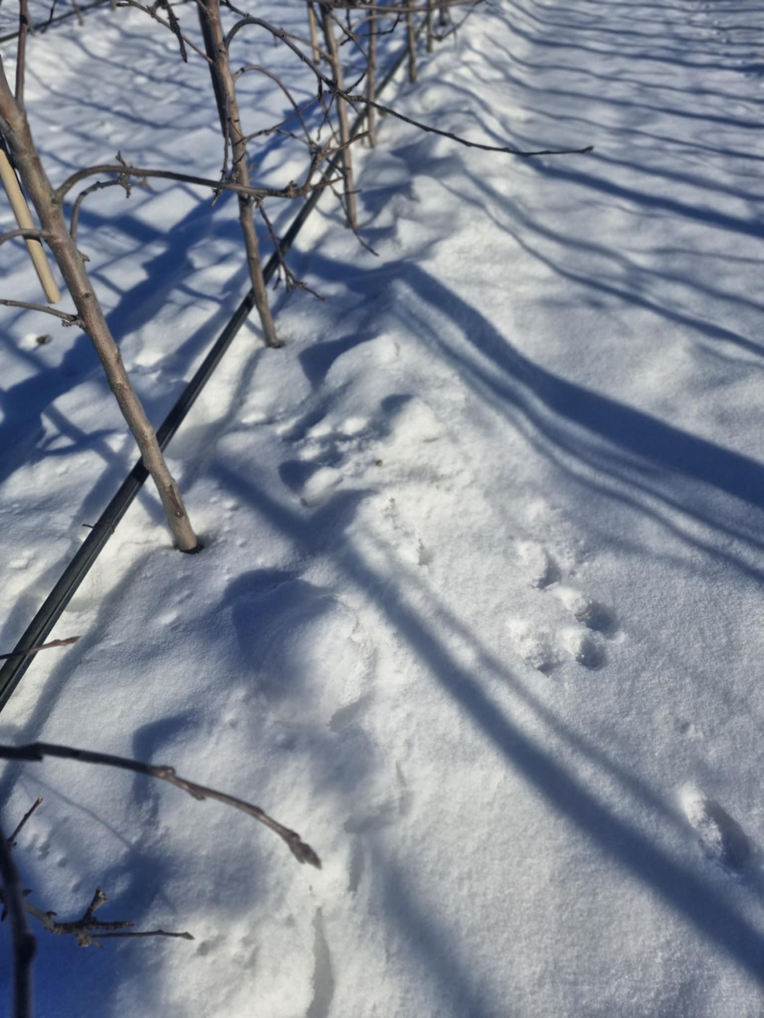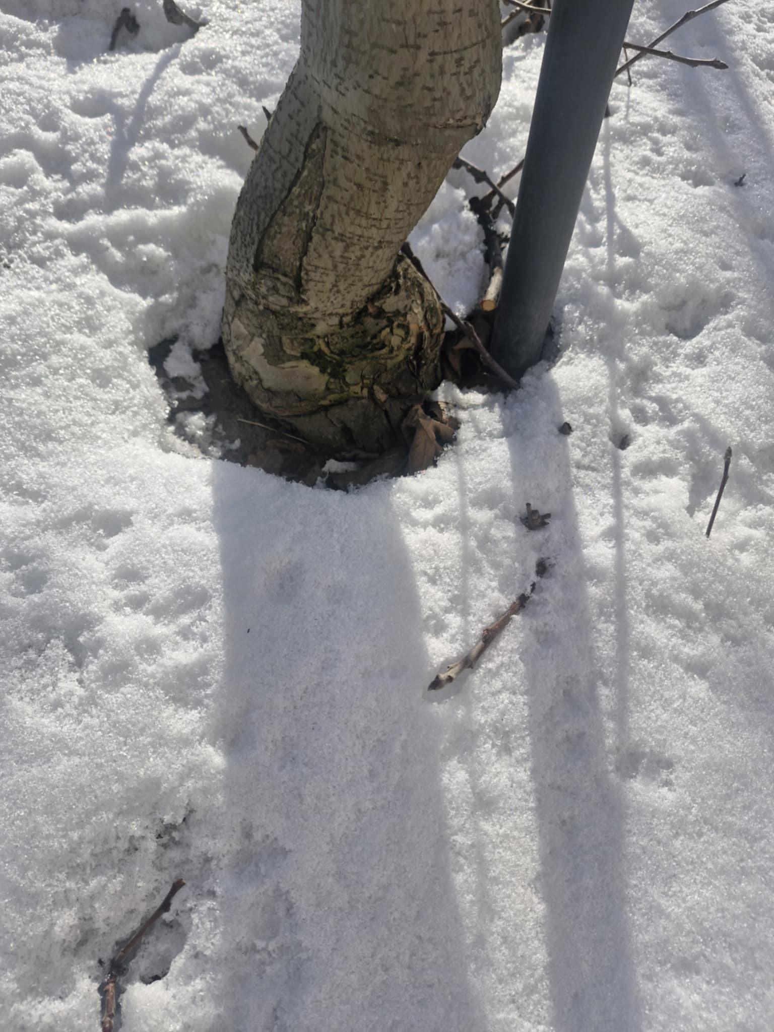 Inaczej wygląda to w młodych nasadzeniach, które Marcin celowo obsypał śniegiem. W tych kwaterach miejsce szczepienia i podstawa pnia są przykryte białą warstwą, która działa jak izolator. Temperatura przy szyjce korzeniowej nie spada tak gwałtownie jak w miejscach, gdzie śniegu brakuje.