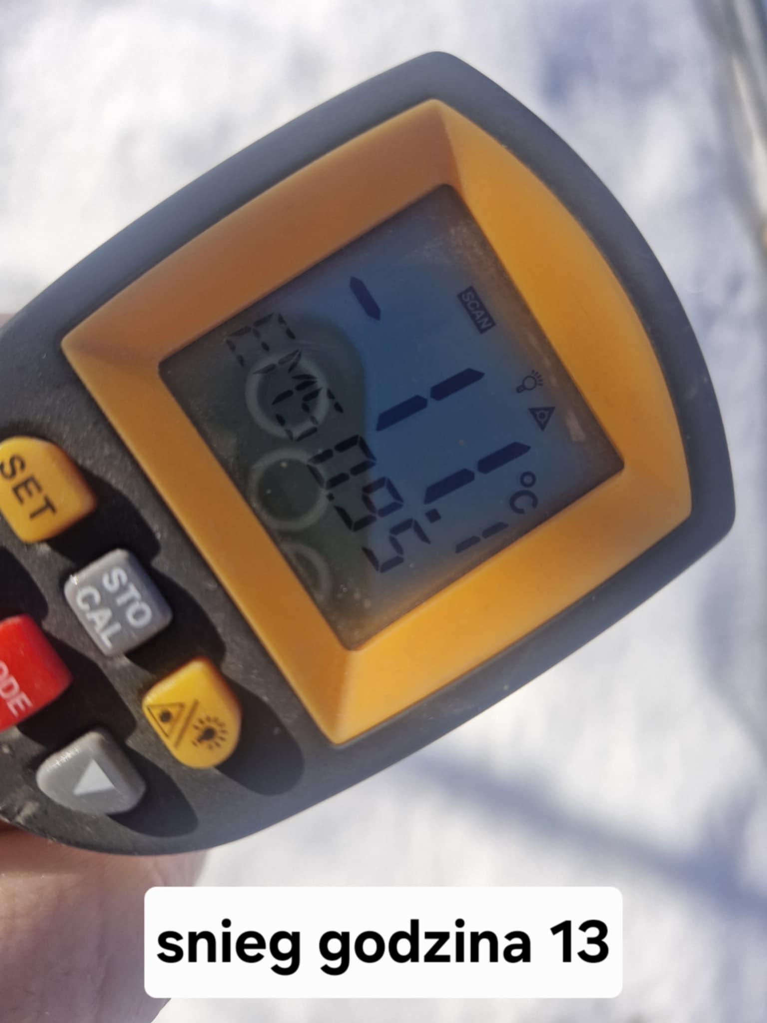 Około godziny 13.00 temperatura powietrza w sadzie wynosiła około –12°C. W takich warunkach Marcin Piesiewicz sprawdził temperaturę na śniegu, czarnej rurce od nawadniania i pniu drzewa (młode nasadzenie). Śnieg, jako powierzchnia jasna i dobrze odbijająca promieniowanie, miał temperaturę około –11°C, czyli niemal taką samą jak otoczenie. Mimo silnego słońca nie nagrzewa się.