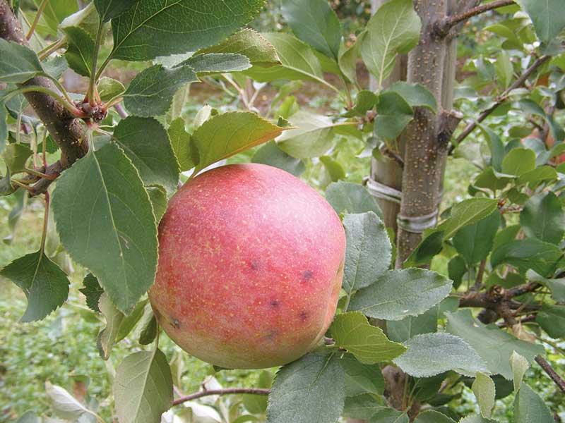 Późnym latem, w sierpniu i we wrześniu na jabłkach różnych odmian może pojawiać się plamistość przetchlinkowa, w postaci zaczerwienionych plamek wokół przetchlinek na skórce jabłek. Jeśli plamki powstaną po stronie zaczerwienionej, wówczas choroba może ulec zamaskowaniu. Po pewnym czasie takie przetchlinki korkowacieją, co potęguje zjawisko ordzawienia się owoców. Sezon wiosenno-letni 2013 r. sprzyjał temu zaburzeniu. A odpowiedzialne za to były niekorzystne warunki atmosferyczne w okresie kwitnienia (i tuż po nim) oraz wzrostu zawiązków owocowych, czyli częste i intensywne opady deszczu, początkowo niska temperatura, a później gwałtowne jej zmiany (szybki wzrost po okresie ochłodzenia i odwrotnie). Sprzyjało to występowaniu nocą rosy, co mogło przyczynić się do powstania ordzawień na owocach. Niekorzystna dla jakości jabłek okazała się także susza latem. W sadach bez nawadniania różnice w uwodnieniu podłoża i owoców były bardzo duże, co uwidoczniło się m.in. w wyglądzie ich skórki. W bieżącym sezonie do ordzawień na skórce jabłek przyczyniły się przymrozki wiosenne (fot. 3).