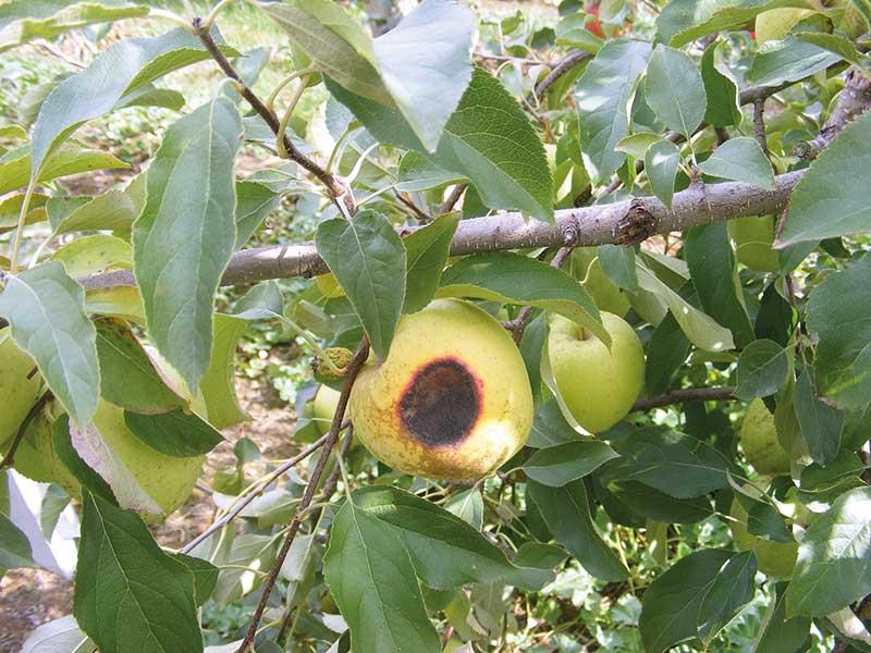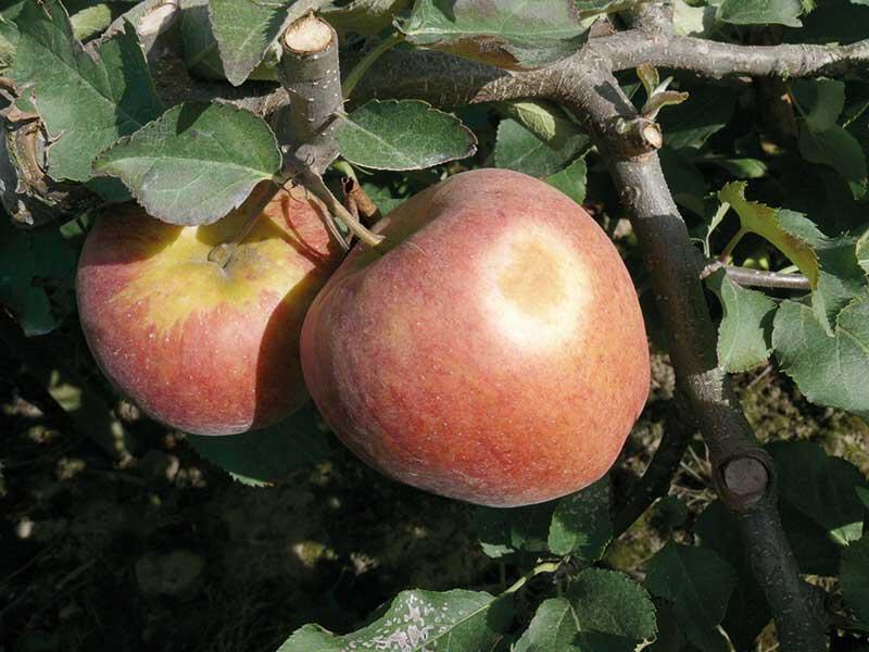 2013 r.) może powodować oparzenia słoneczne owoców po stronie bezpośrednio wystawionej na promieniowanie (fot. 2). W ub. sezonie takich dni było dużo, większość beżowych plam oparzeniowych zmieniła zabarwienie na czarne, z czerwoną obwódką, co dyskwalifikowało jabłka do przechowywania. Cięcie letnie przeprowadzane w celu doświetlenia owoców potęgowało powstawanie plam oparzeniowych. Liczba jabłek z objawami oparzeń słonecznych nie miała wpływu na ograniczenie plonu wczesnych odmian jabłoni przeznaczonych do bezpośredniego spożycia oraz zimowych, przeznaczanych do przechowywania.