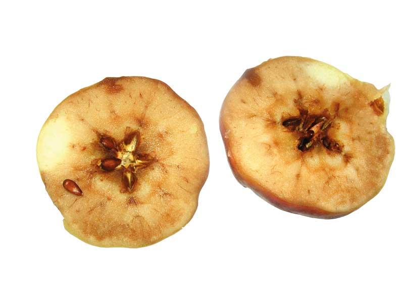 Z warunkami atmosferycznymi panującymi podczas całej wegetacji, częstotliwością zabiegów ochroniarskich i pielęgnacyjnych, optymalnym terminem zbioru i warunkami podczas przechowywania wiąże się podatność na inne zaburzenia fizjologiczne podczas przechowywania. Mogą nimi być np.: oparzelizna powierzchniowa (fot. 4), miękka oparzelizna chłodniowa, rozpad chłodniczy, rozpad starczy (fot. 5) czy zbrązowienie przygniezdne. Tego typu zaburzenia stymulują: długotrwała ciepła i słoneczna pogoda podczas wegetacji, ale i przewaga dni z niską temperaturą, głównie w okresie okołozbiorczym, niska zawartość wapnia w owocach, zbyt wczesny zbiór i za wczesne lub za późne po nim schłodzenie owoców, niska temperatura podczas przechowywania oraz nieprawidłowy skład atmosfery w komorach chłodniczych (stężenie tlenu i dwutlenku węgla).